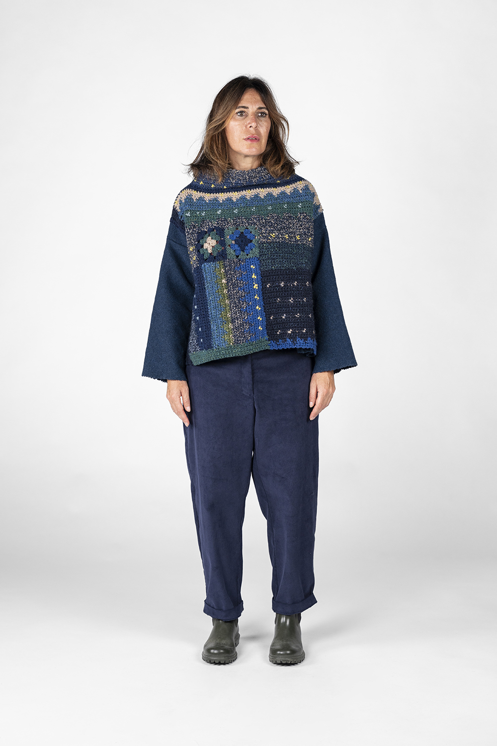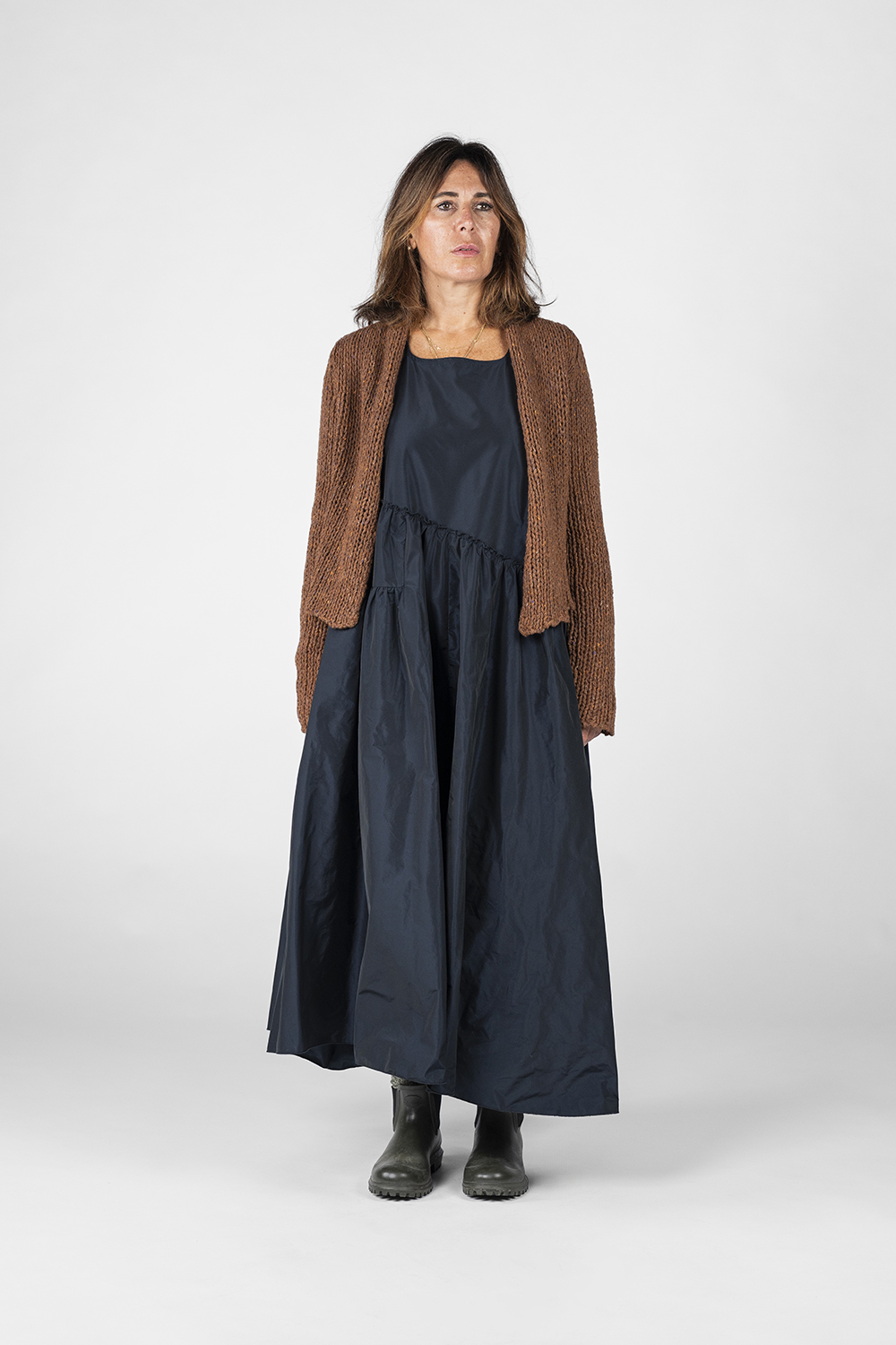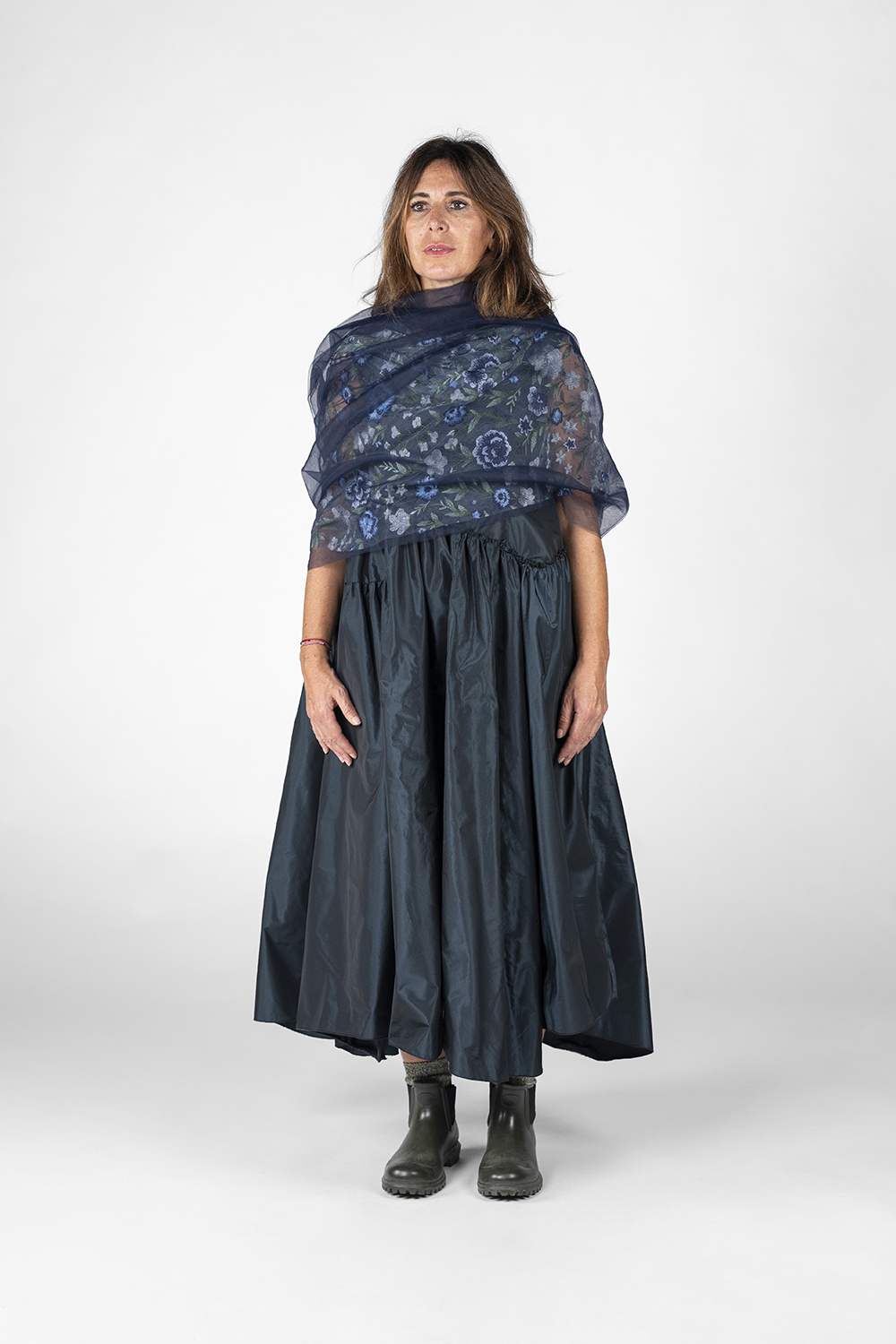 Tessuti di seta, taffetà, filati naturali come lana e cotone vengono abbinati a lavorazioni jacquard, ricami rigorosamente eseguiti a mano, creazioni all’uncinetto e patchwork, in una ricerca dei materiali più adatti che ha sempre un ruolo centrale nelle nostre realizzazioni.