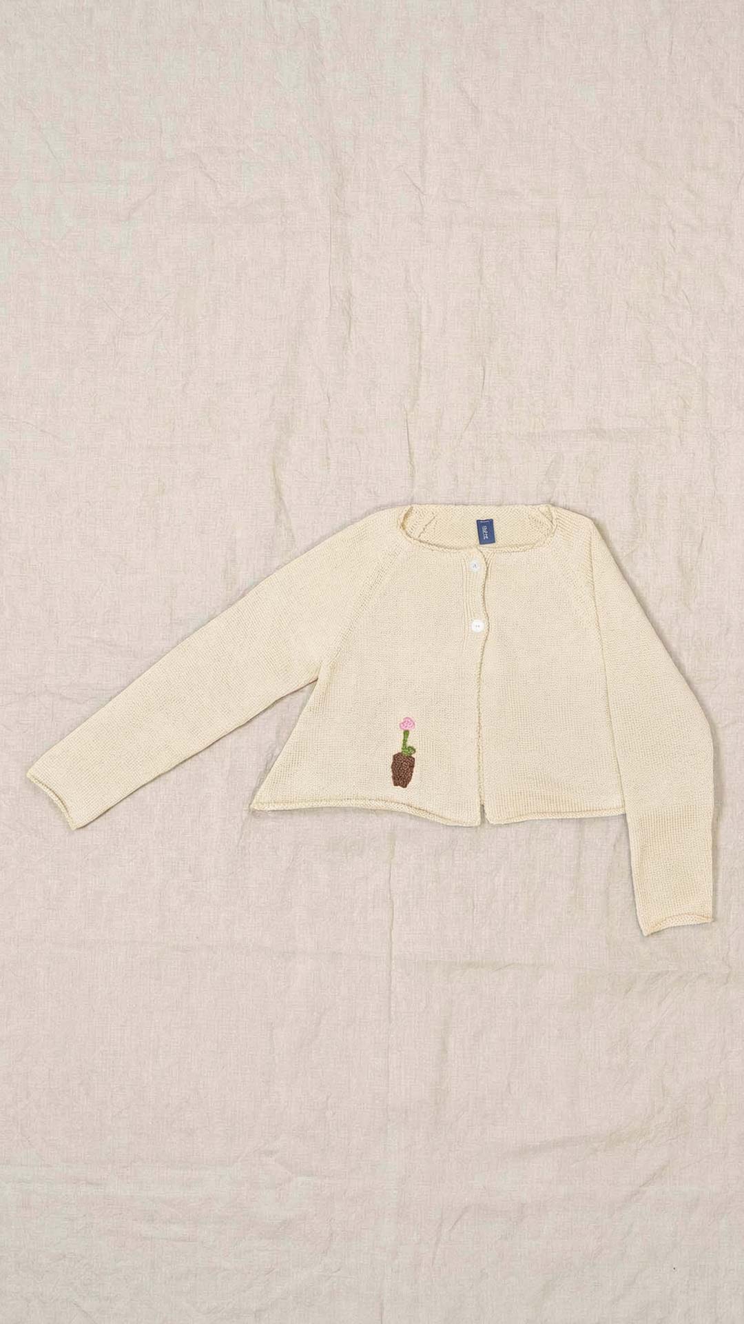 Open knit with two buttons at the top, raglan sleeves, and a slightly flared silhouette. Crochet appliqués on the front and back define the design. A small cardigan with a lightweight structure and a feminine, contemporary feel.