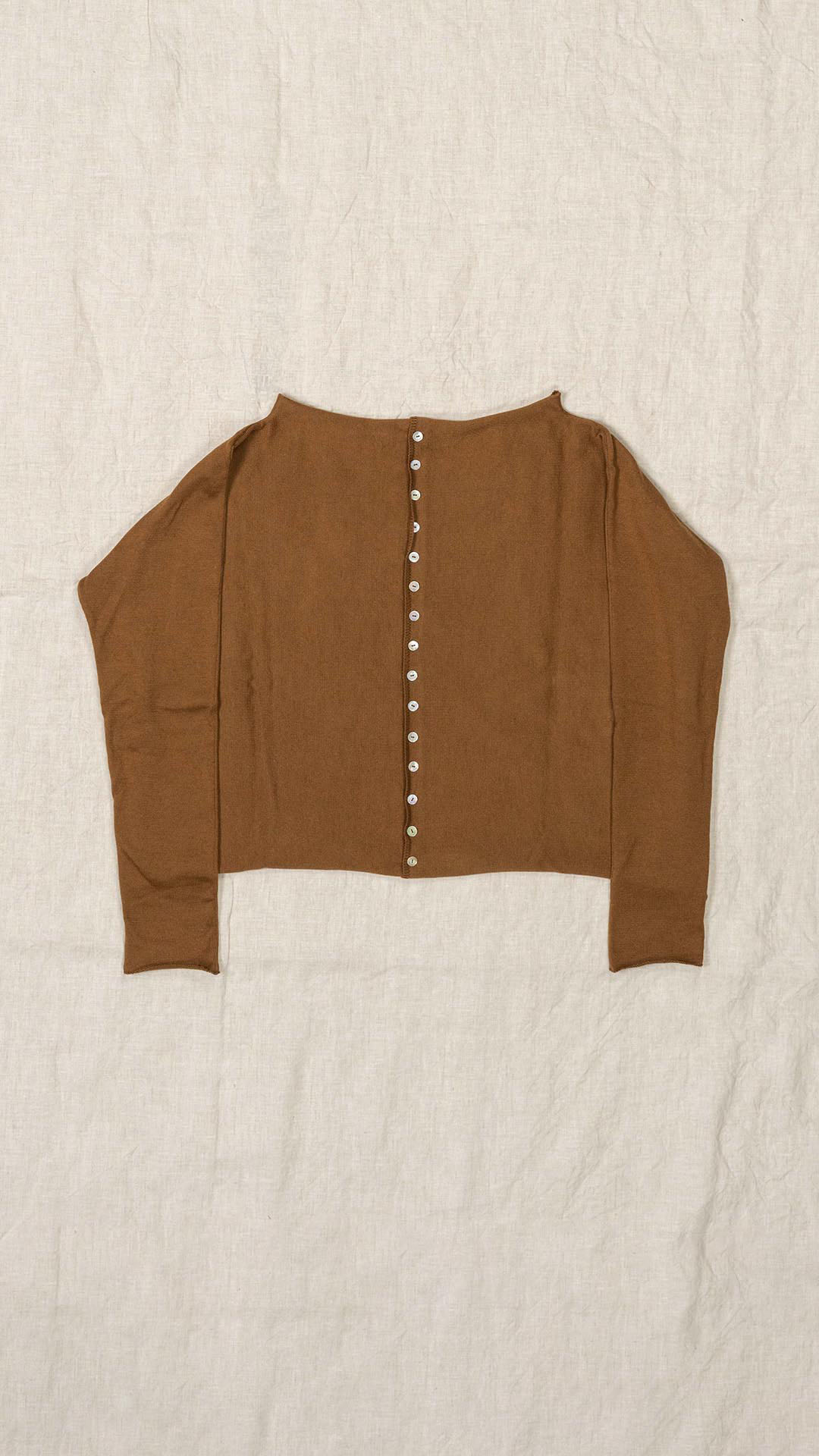 Kimono-style sweater with a boat neckline and a row of fifteen mother-of-pearl buttons. The garment, worked from the sleeve, is reversible and can be worn buttoned at the front or back. An iconic model from the Officinae collection.