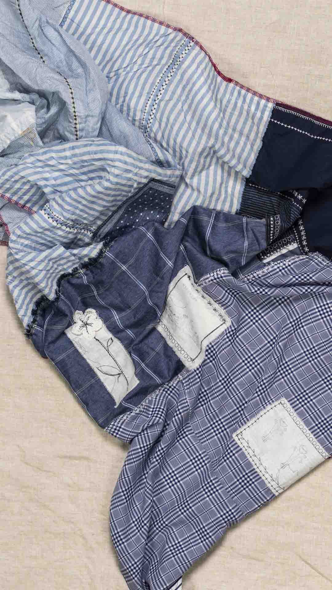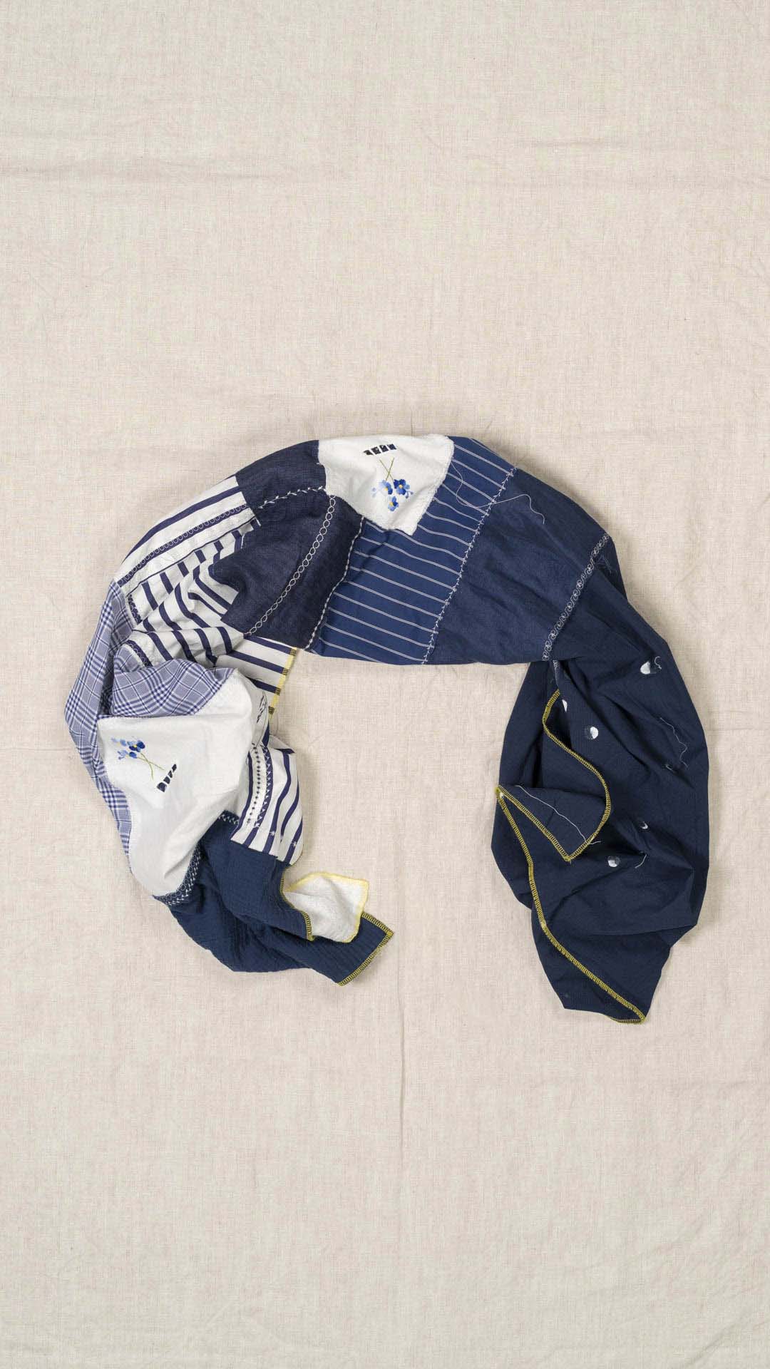 Entirely handmade from scraps left over from other garments, selected in different shades of color, embellished with inserts of vintage napkins found in flea markets and small stamps in the predominant colors. Wide and enveloping, it can be worn on the shoulders, tied around the neck, or used as a decorative element. Each scarf is unique. Dimensions: approximately 200 x 150 cm.