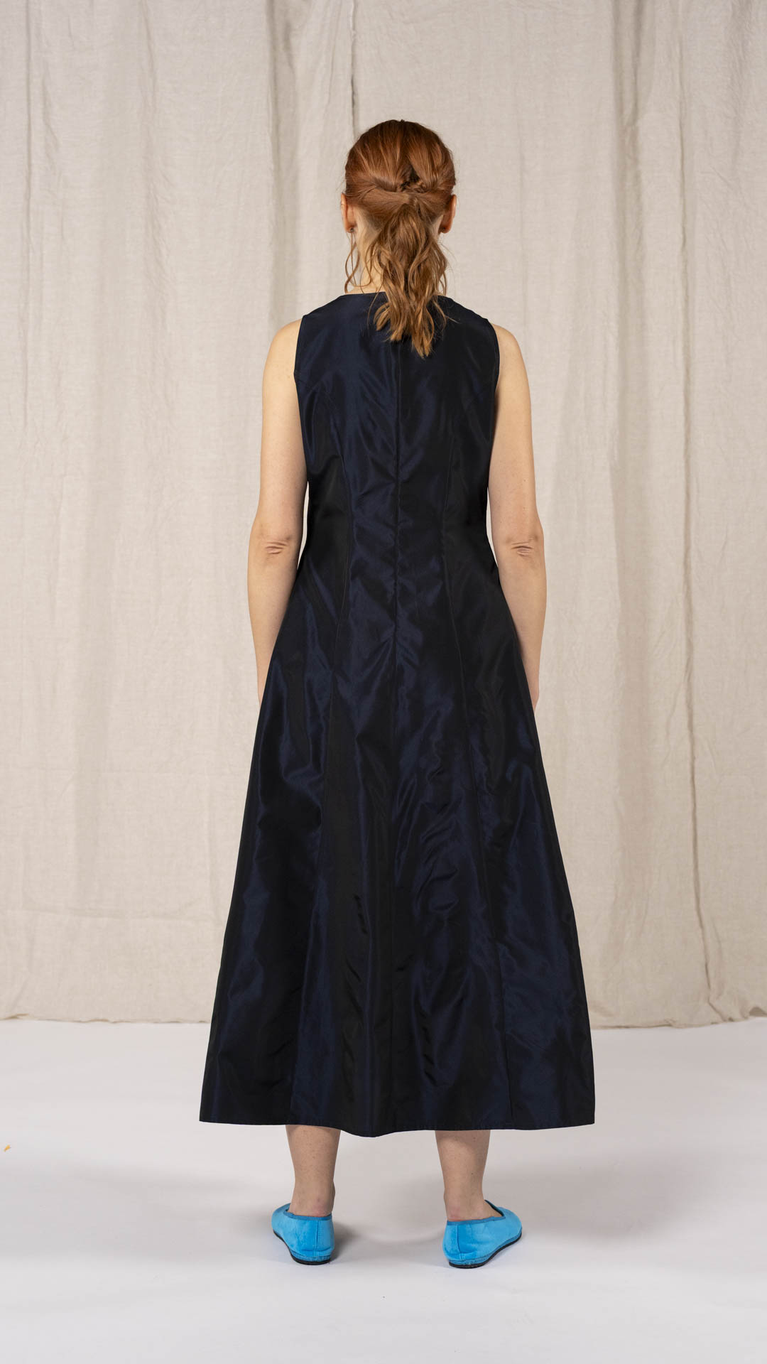 Taffeta dress with a round neckline and zipper at the back. Two seams at the front define the upper part of the garment, while the line opens slightly from the waist, creating a soft and slightly flared silhouette. A dress with a simple and versatile design.