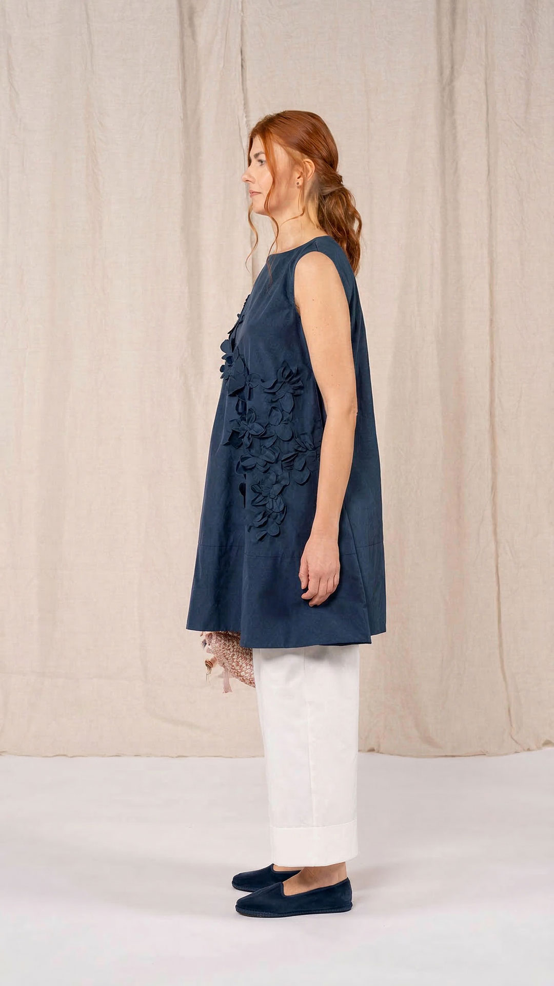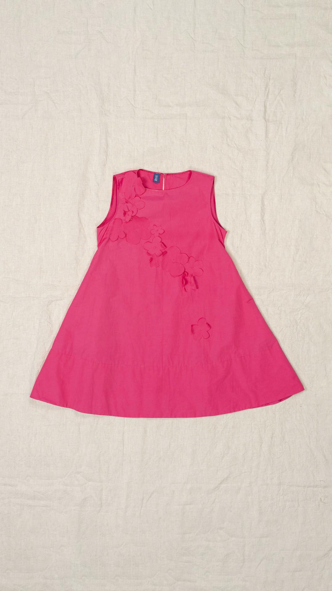 Taffeta dress with boat neckline, wide and flared silhouette, and side pockets. The front features matching floral appliqués, laser-cut in different sizes, which characterize the design of the garment. At the back, the opening with a small mother-of-pearl button and flying buttonhole adds character to the garment.