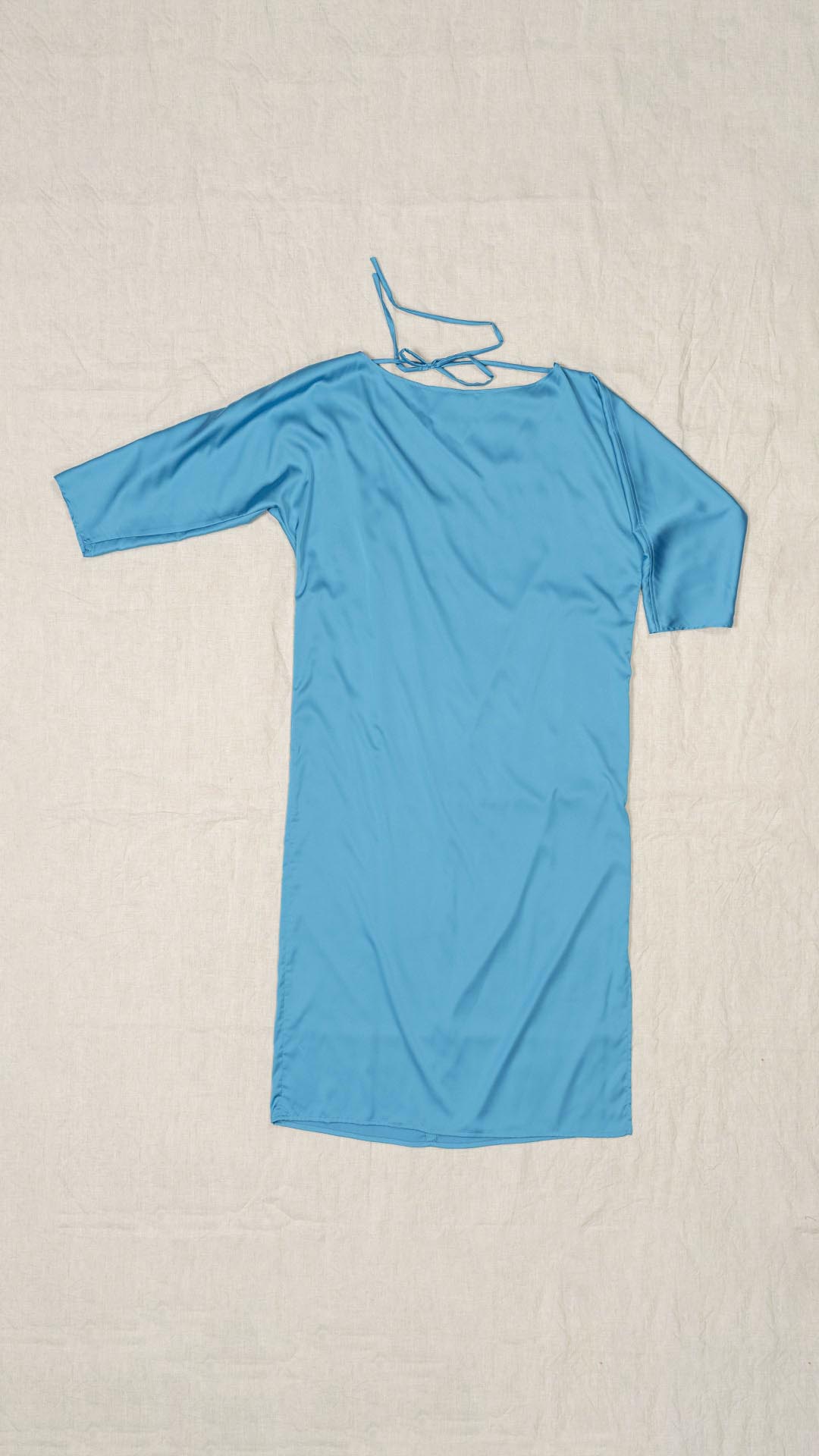 Dress consisting of two separate pieces: a tunic with full sleeves, asymmetrical neckline, V-neck on one side and boat neck on the other, and a fabric tie that can be knotted at the neck. The garment features a deep side slit. A highly versatile and characterful design, which can also be worn with the Palla skirt.