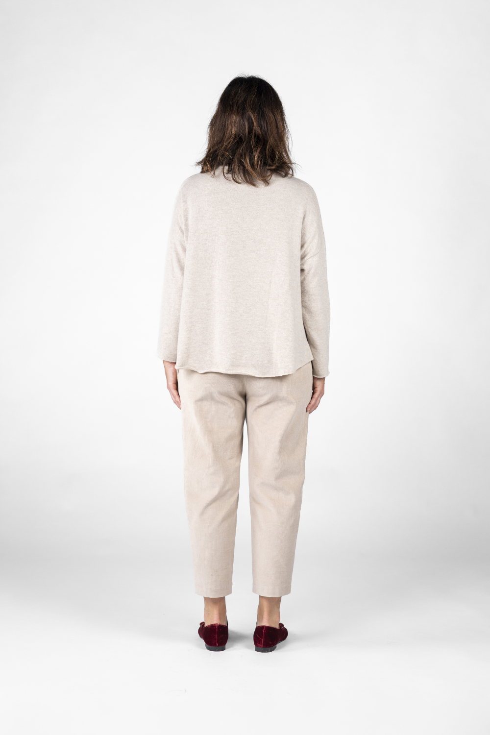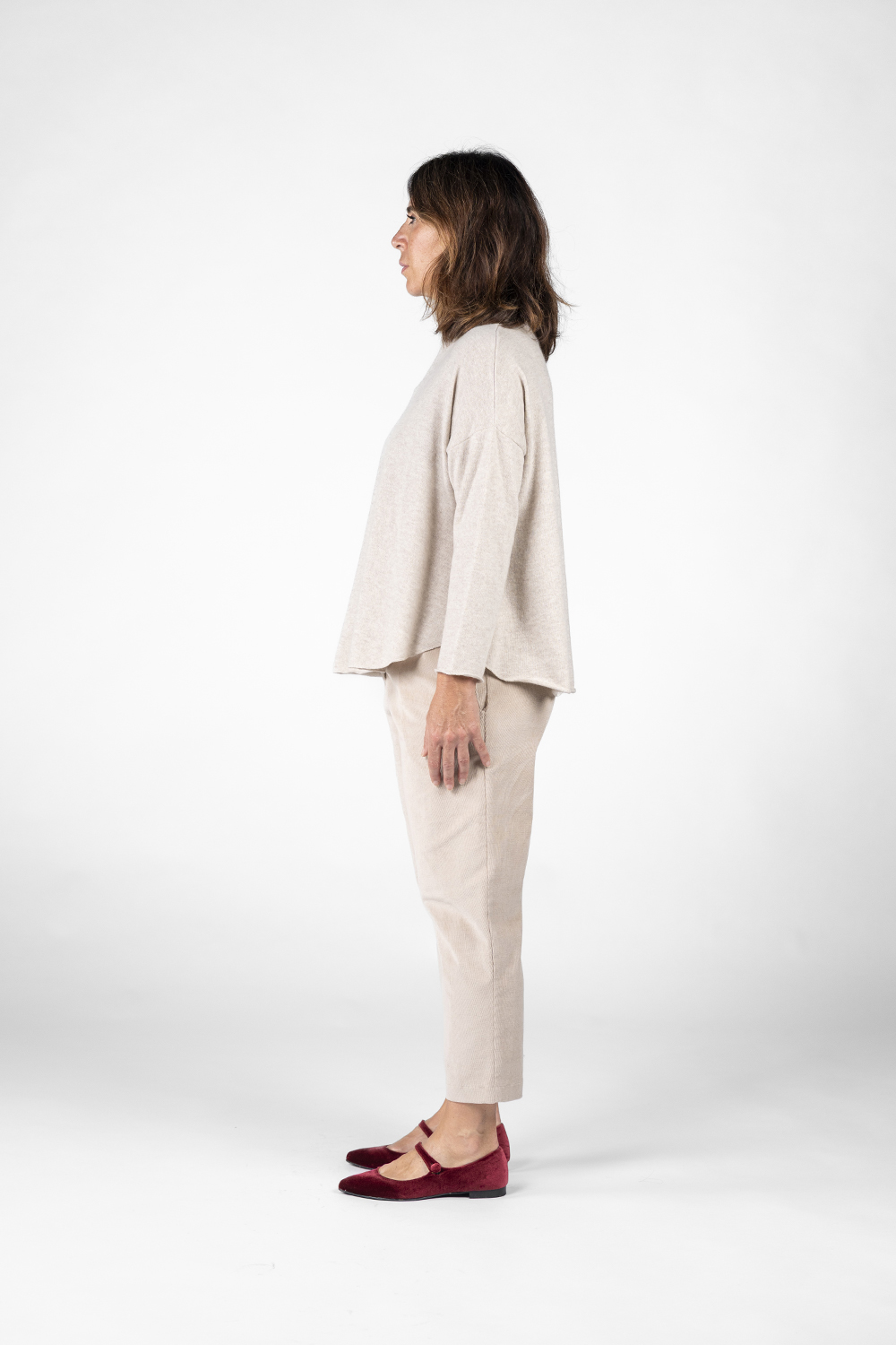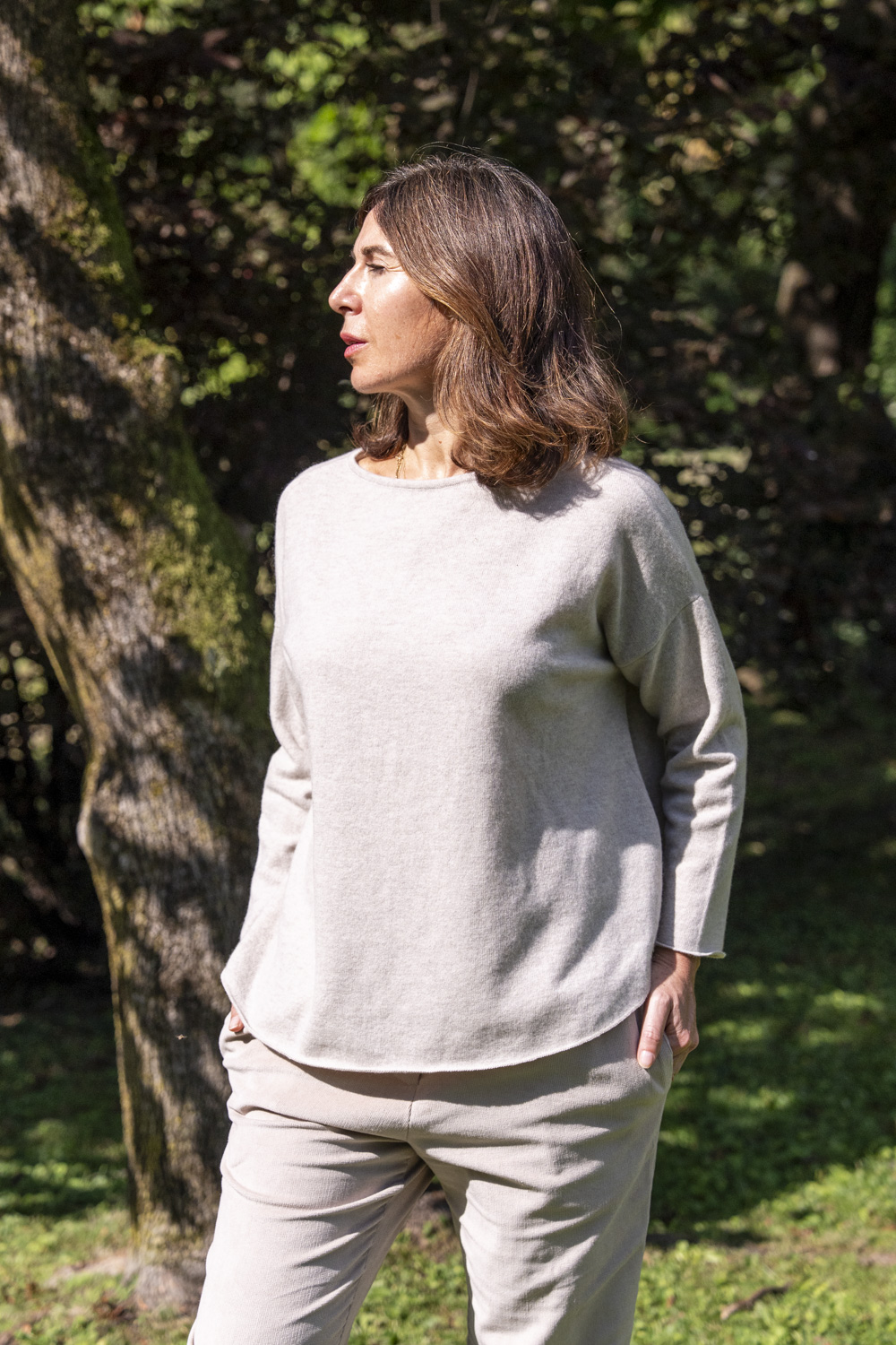 Sweater made from warm Canberra wool, a fine-quality yarn entirely spun and crafted in Italy. Designed for those who appreciate soft volumes and slightly flared lines, it perfectly balances comfort and style. Ideal for creating casual yet refined and sophisticated outfits.