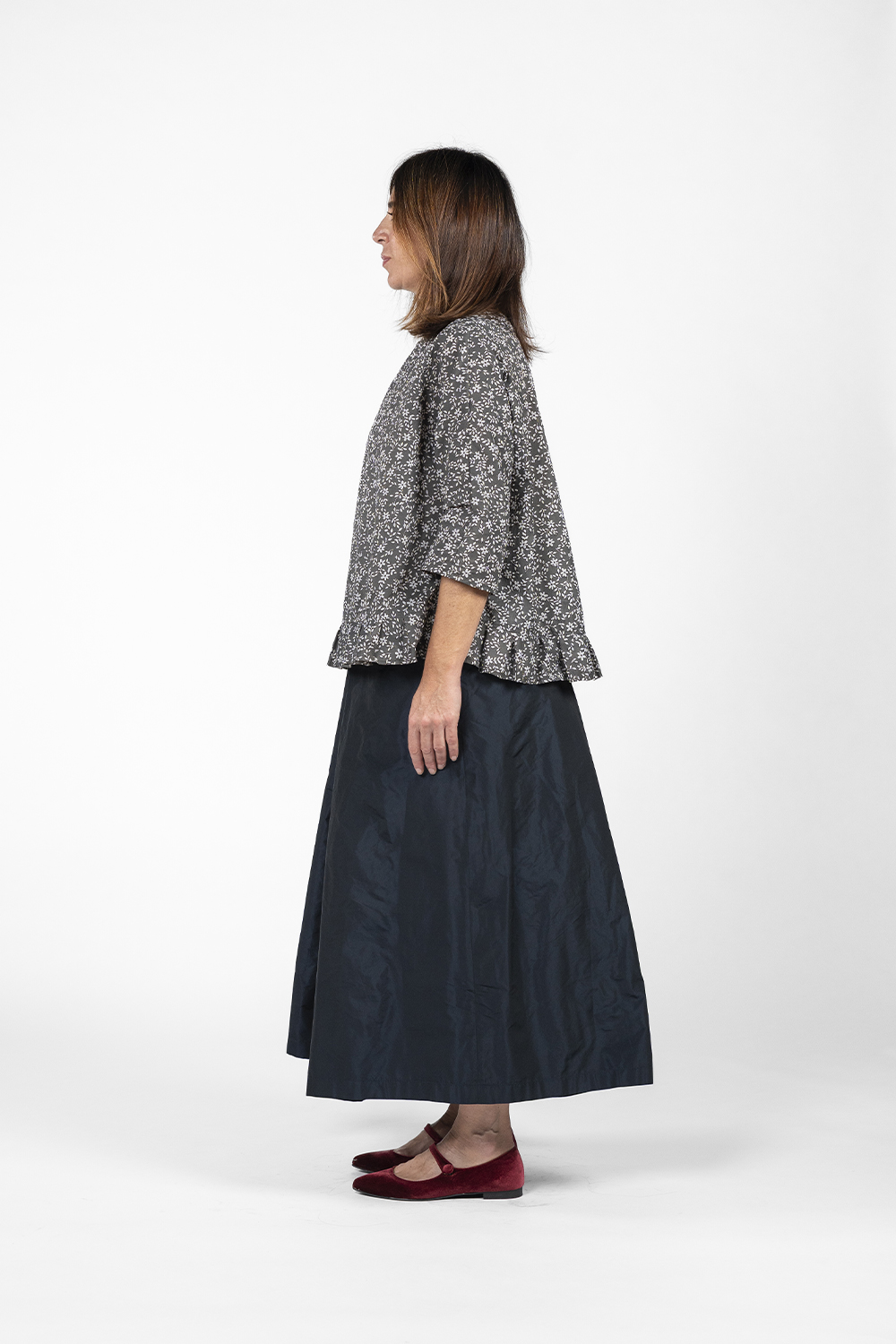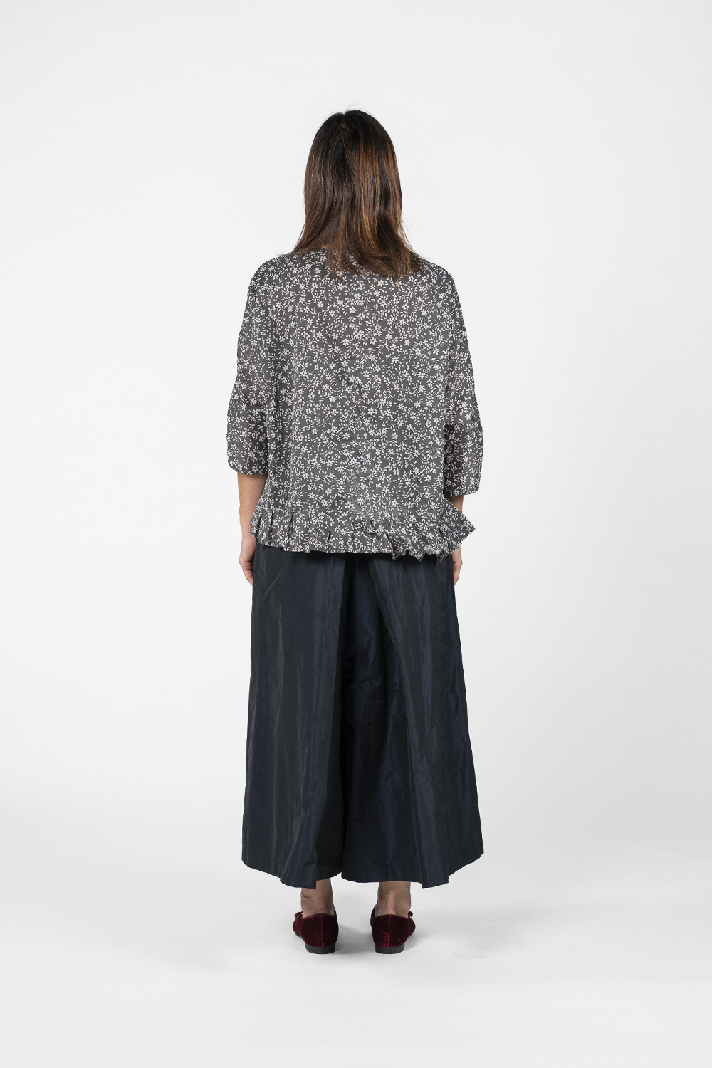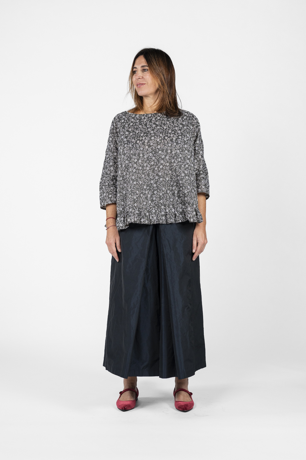 Crew-neck blouse with 3/4 sleeves, crafted from printed fabric featuring floral motifs. The design is defined by hand-pleated detailing along the hem, which adds a refined, tailored touch while creating natural gathers that bring movement and structure to the piece.