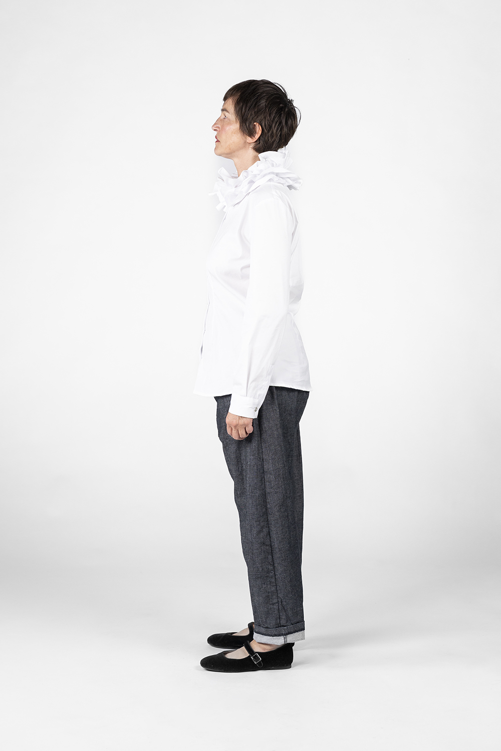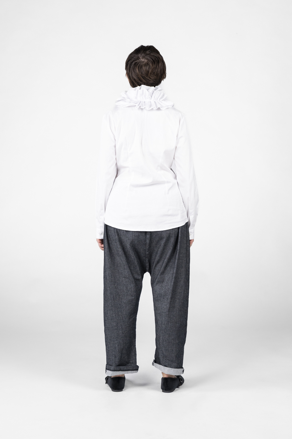 Elegant white poplin shirt with a hint of stretch. Its classic cut is enhanced by two back darts that accentuate the silhouette, following the body’s natural lines. The rich, elegantly ruffled collar delicately frames the face, creating a feminine feel. Mother-of-pearl button fastening.