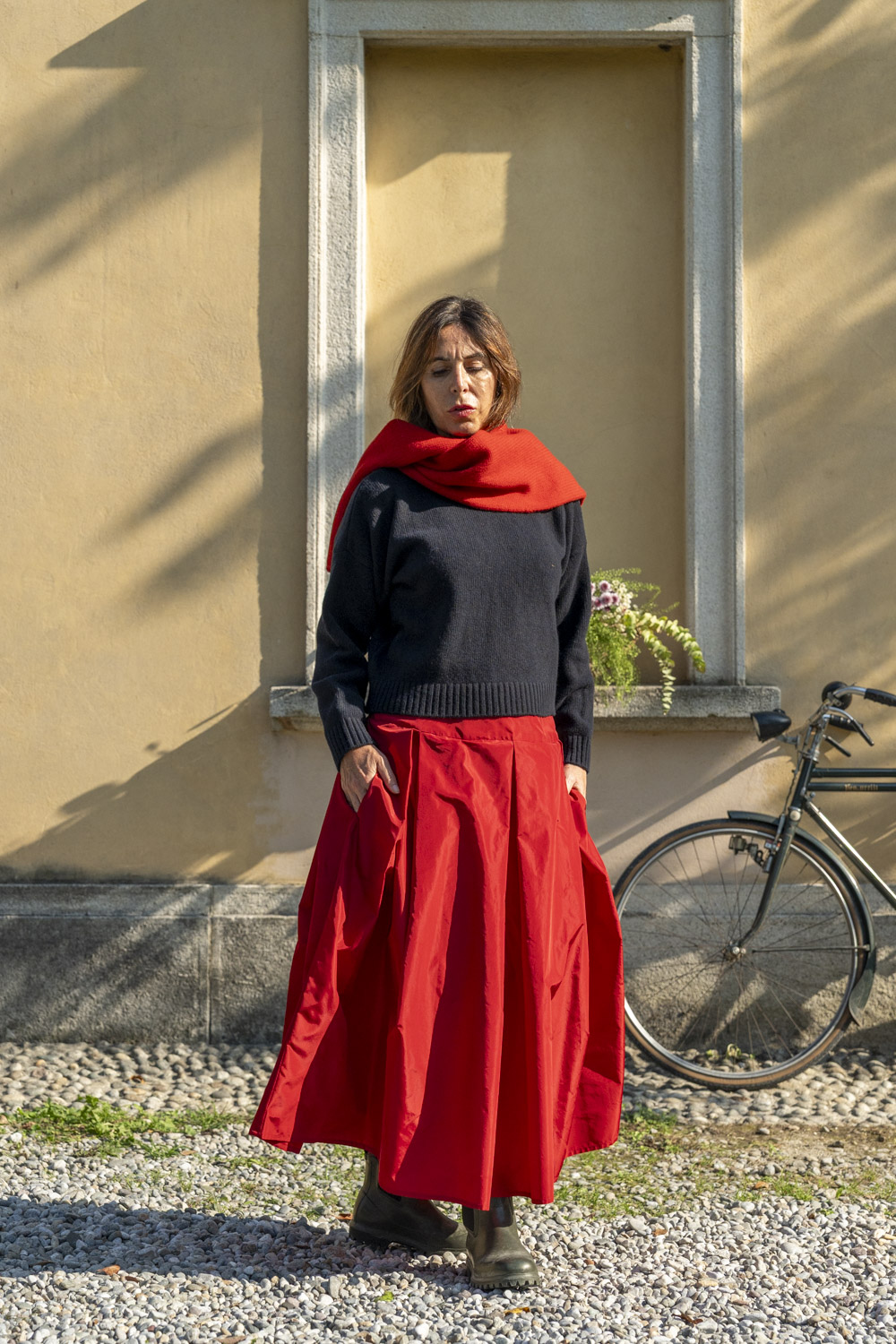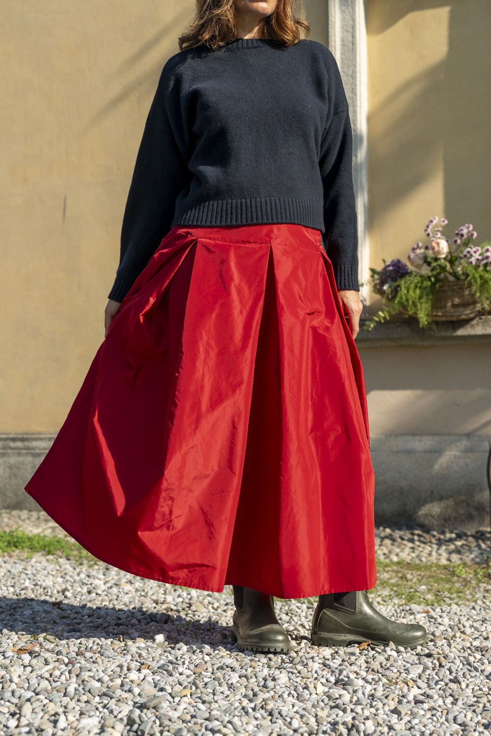 Red taffeta skirt, featuring refined tailoring, concealed pockets, and an invisible zip on the side. The high waistband emphasises the silhouette, while soft pleats cascade down the fabric for a graceful effect. Available in different shades of taffeta.