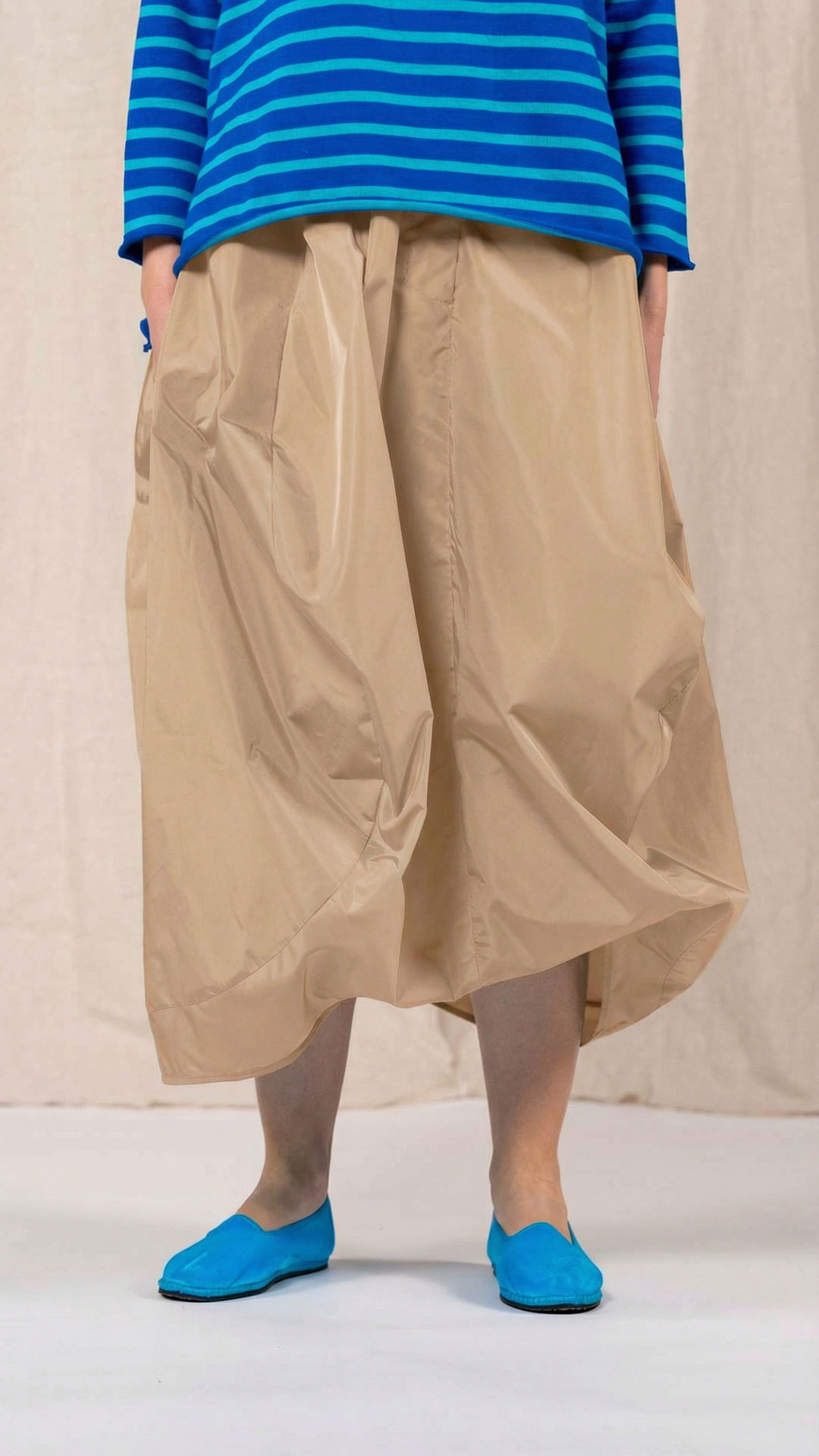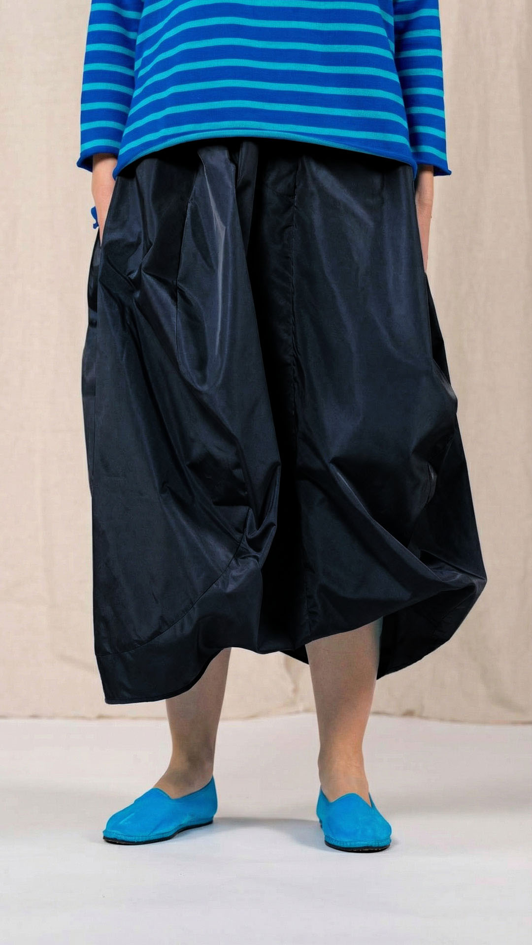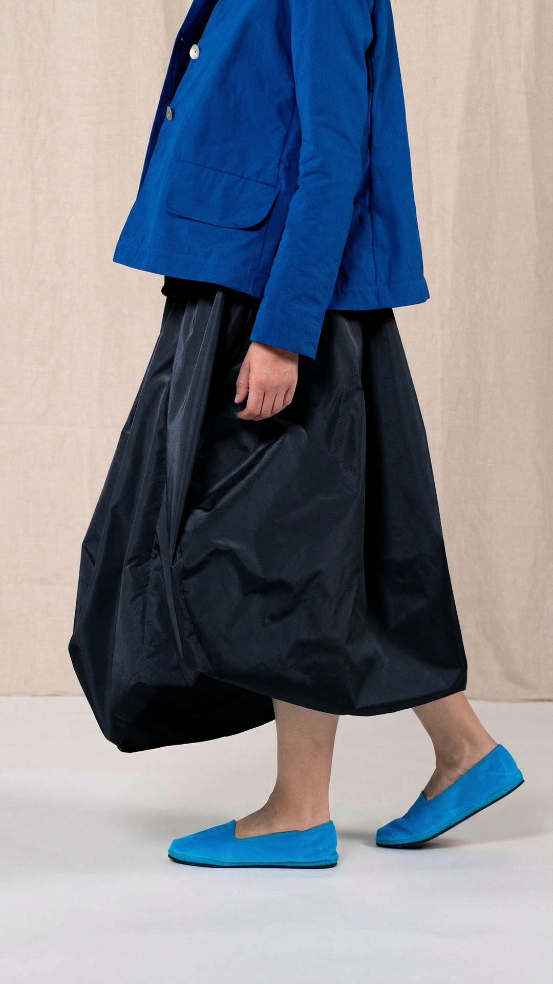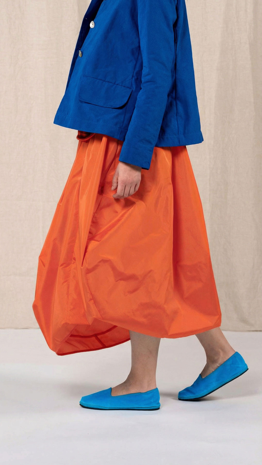 La Gonna Palla, grazie alla sua linea dinamica, strutturata ed elegante, è un capo iconico del brand Officinae. Realizzata in taffetà, grazie a un sistema di coulisse interne, può essere accorciata leggermente sul davanti, aumentando il suo volume e permettendo di giocare con l’effetto finale in base all’occasione o all’umore. Un design unico, che unisce sartorialità ed estro creativo, perfetta per ogni occasione.