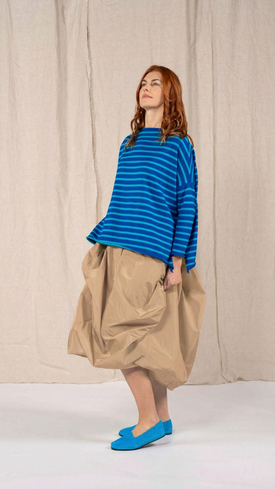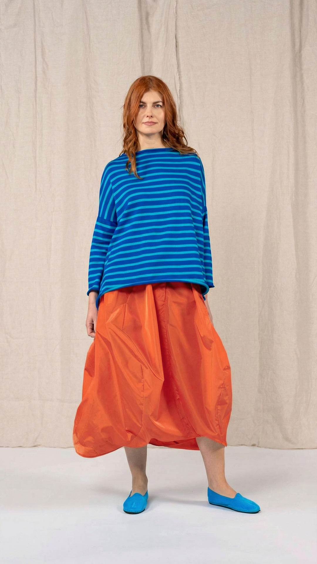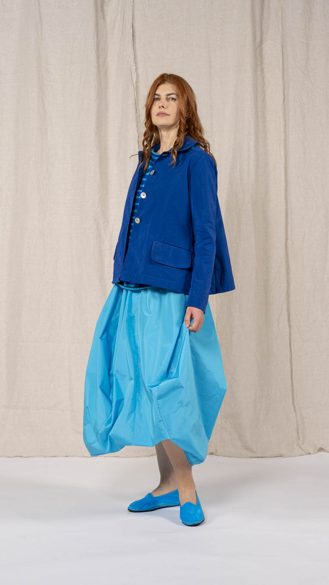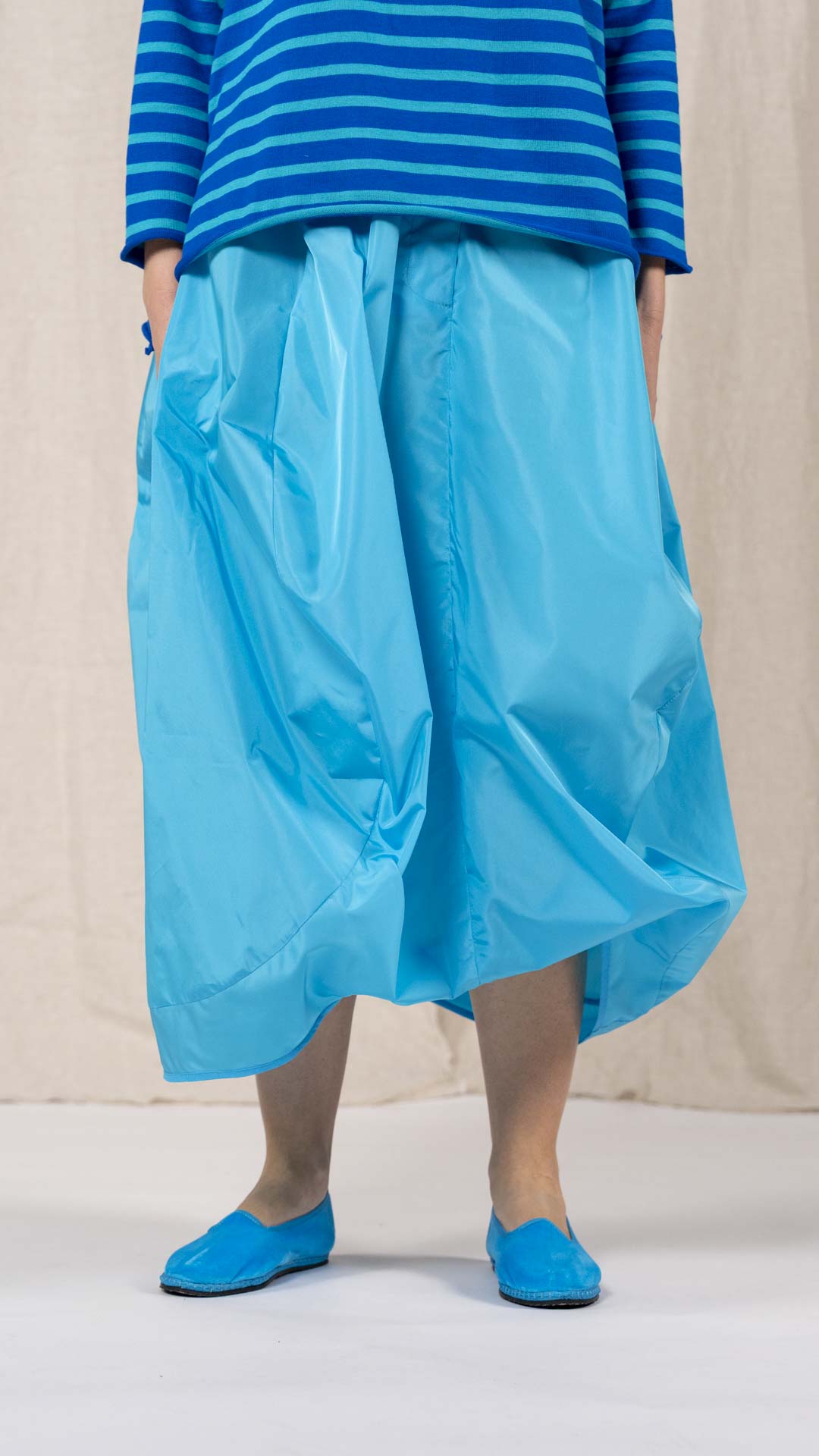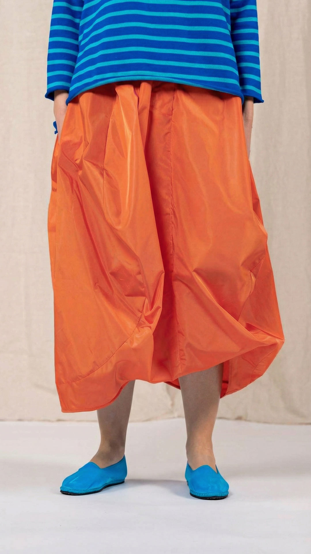 La Gonna Palla, grazie alla sua linea dinamica, strutturata ed elegante, è un capo iconico del brand Officinae. Realizzata in taffetà, grazie a un sistema di coulisse interne, può essere accorciata leggermente sul davanti, aumentando il suo volume e permettendo di giocare con l’effetto finale in base all’occasione o all’umore. Un design unico, che unisce sartorialità ed estro creativo, perfetta per ogni occasione.