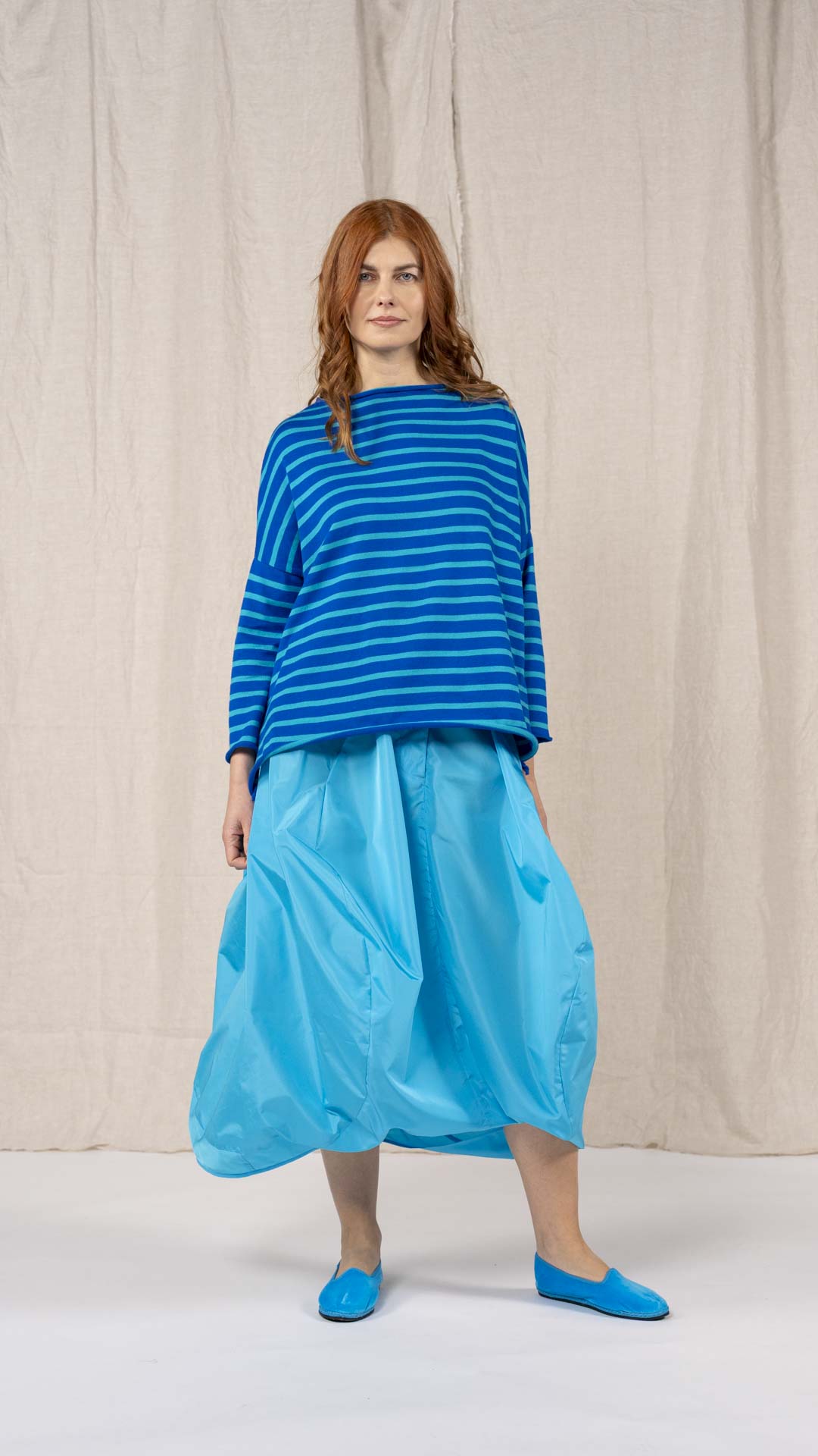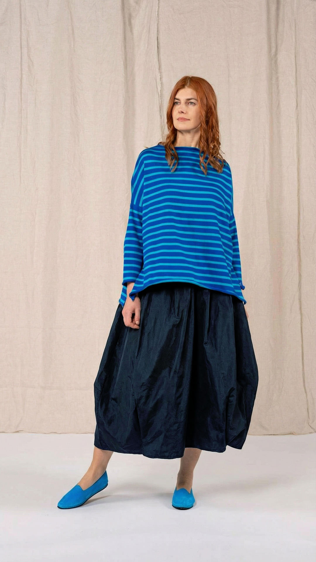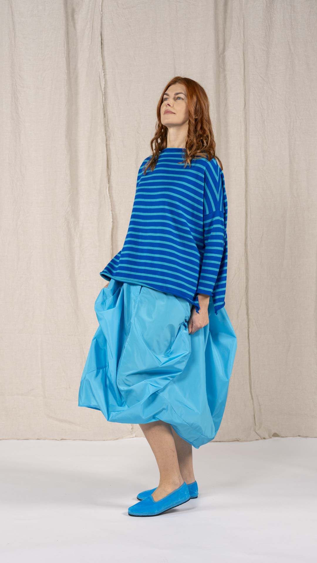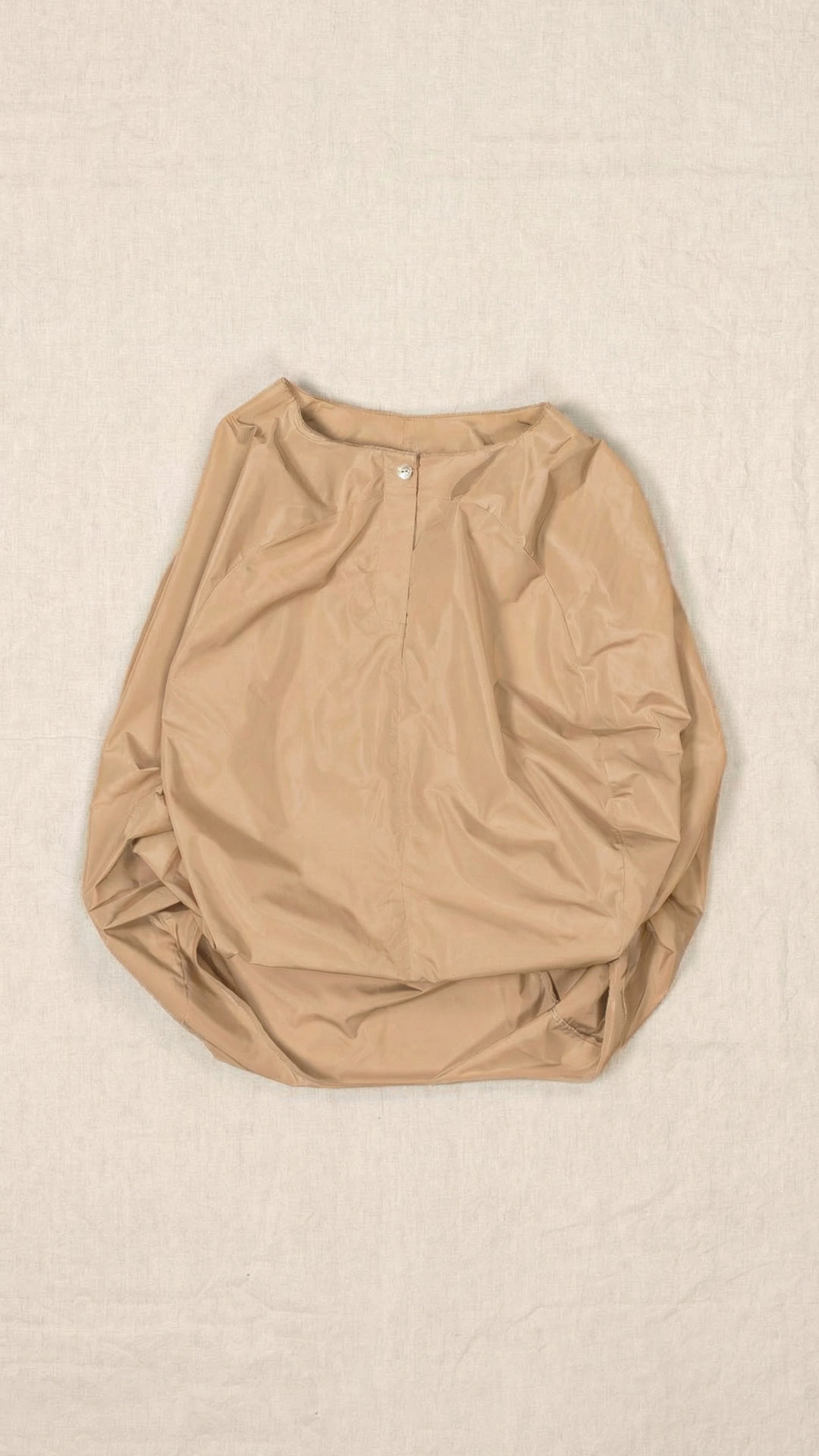 La Gonna Palla, grazie alla sua linea dinamica, strutturata ed elegante, è un capo iconico del brand Officinae. Realizzata in taffetà, grazie a un sistema di coulisse interne, può essere accorciata leggermente sul davanti, aumentando il suo volume e permettendo di giocare con l’effetto finale in base all’occasione o all’umore. Un design unico, che unisce sartorialità ed estro creativo, perfetta per ogni occasione.