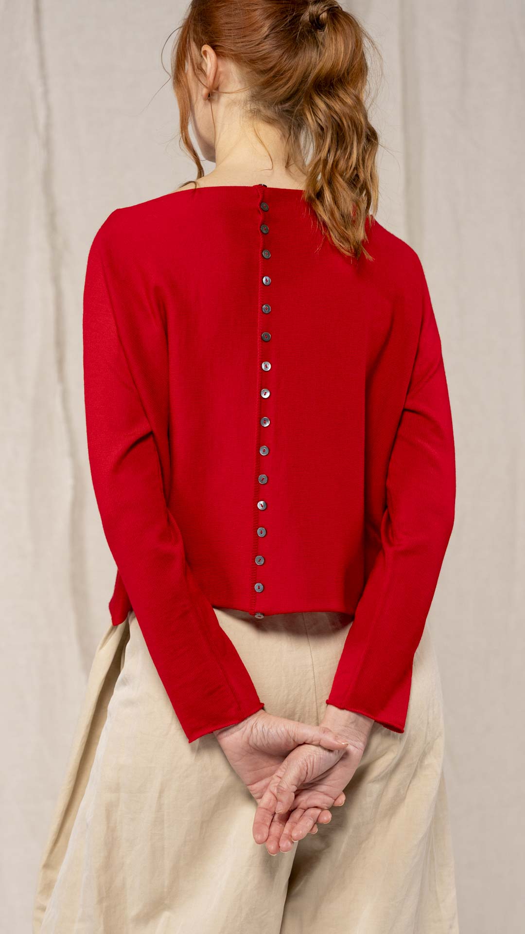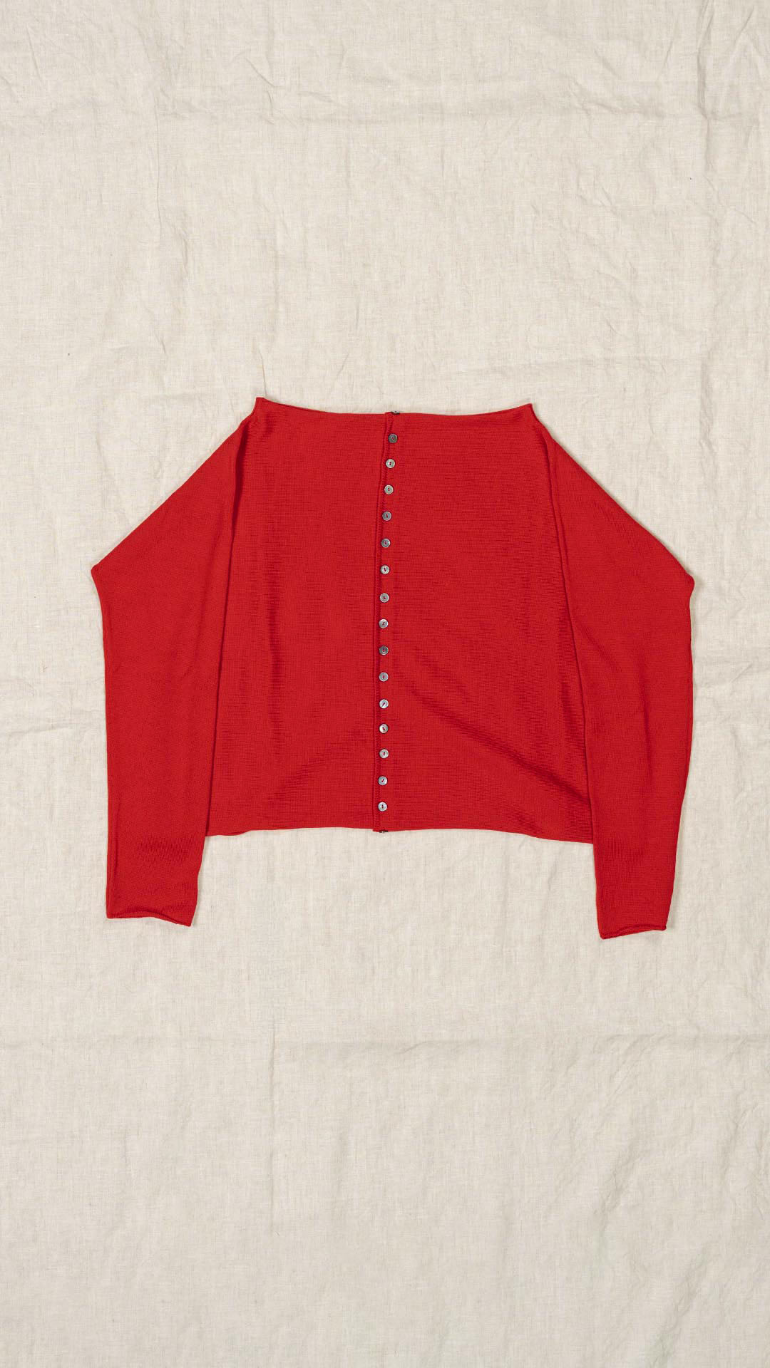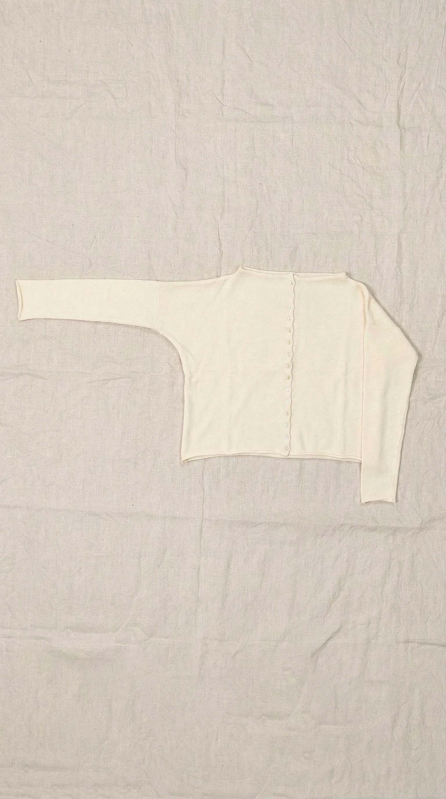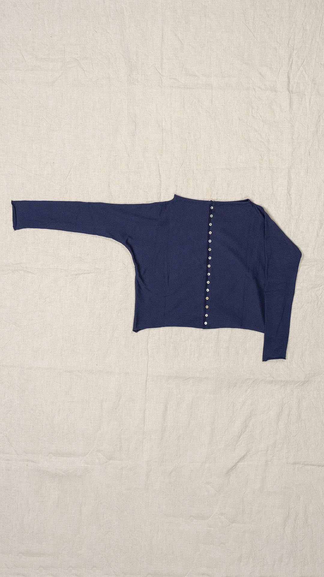 Maglia “Kimono” con scollo a barca e una fila di quindici bottoncini in madreperla. Il capo, lavorato a partire dalla manica, è reversibile e può essere indossato con l’abbottonatura sul davanti o sul retro. Un modello iconico della collezione Officinae.