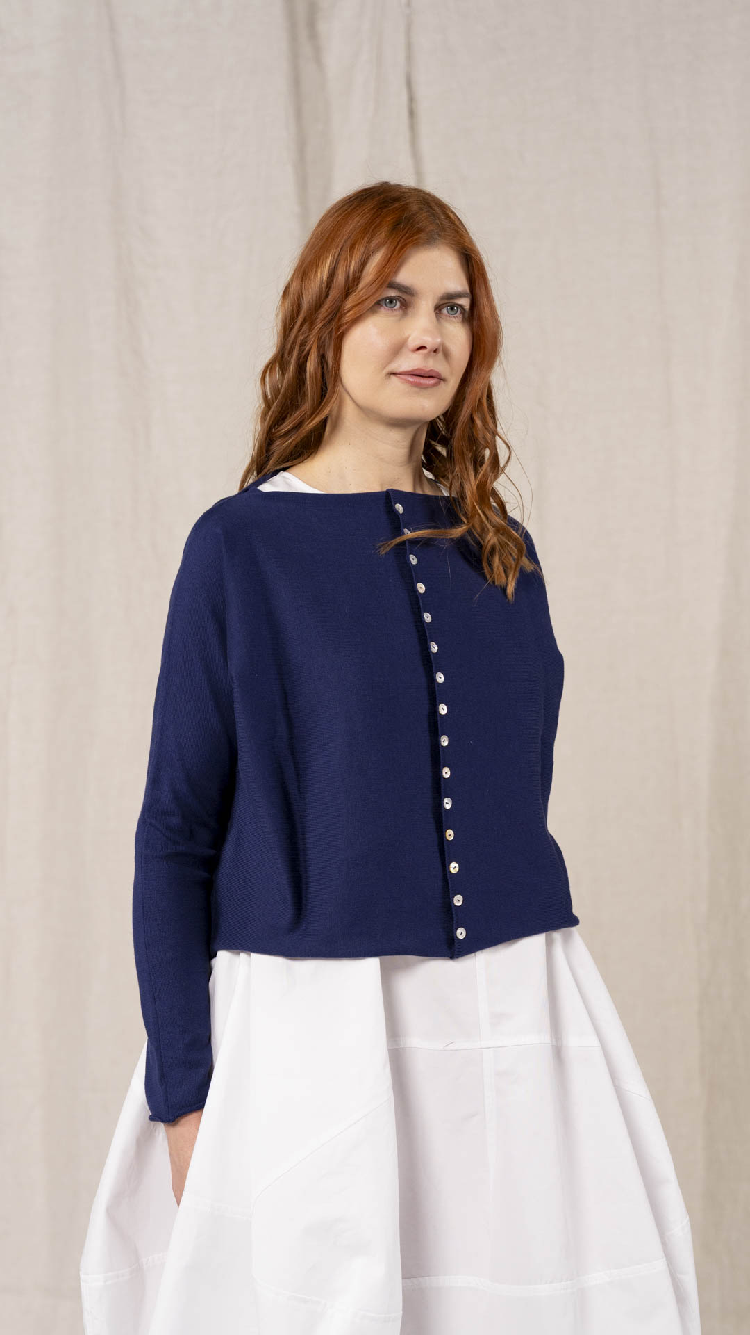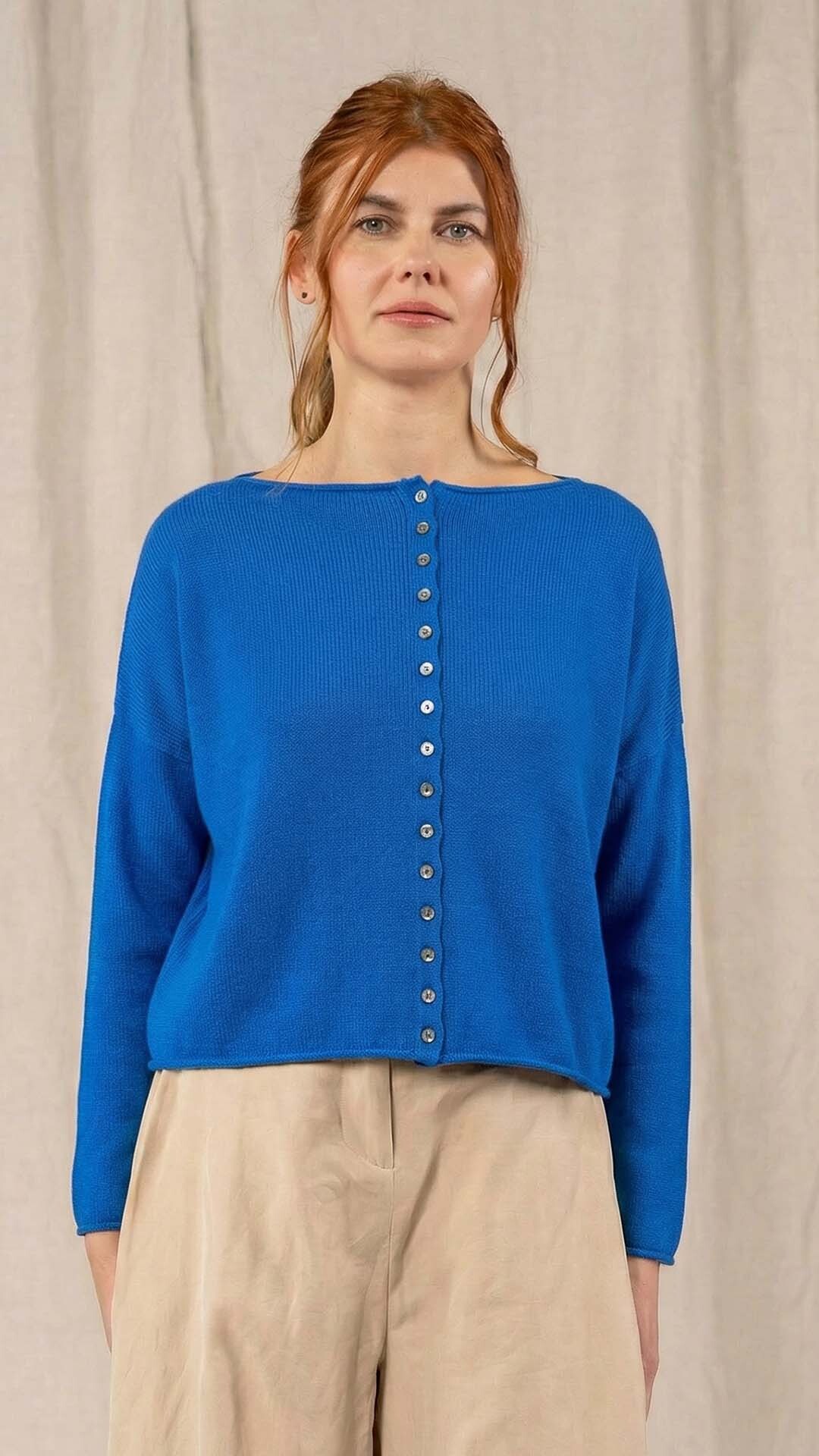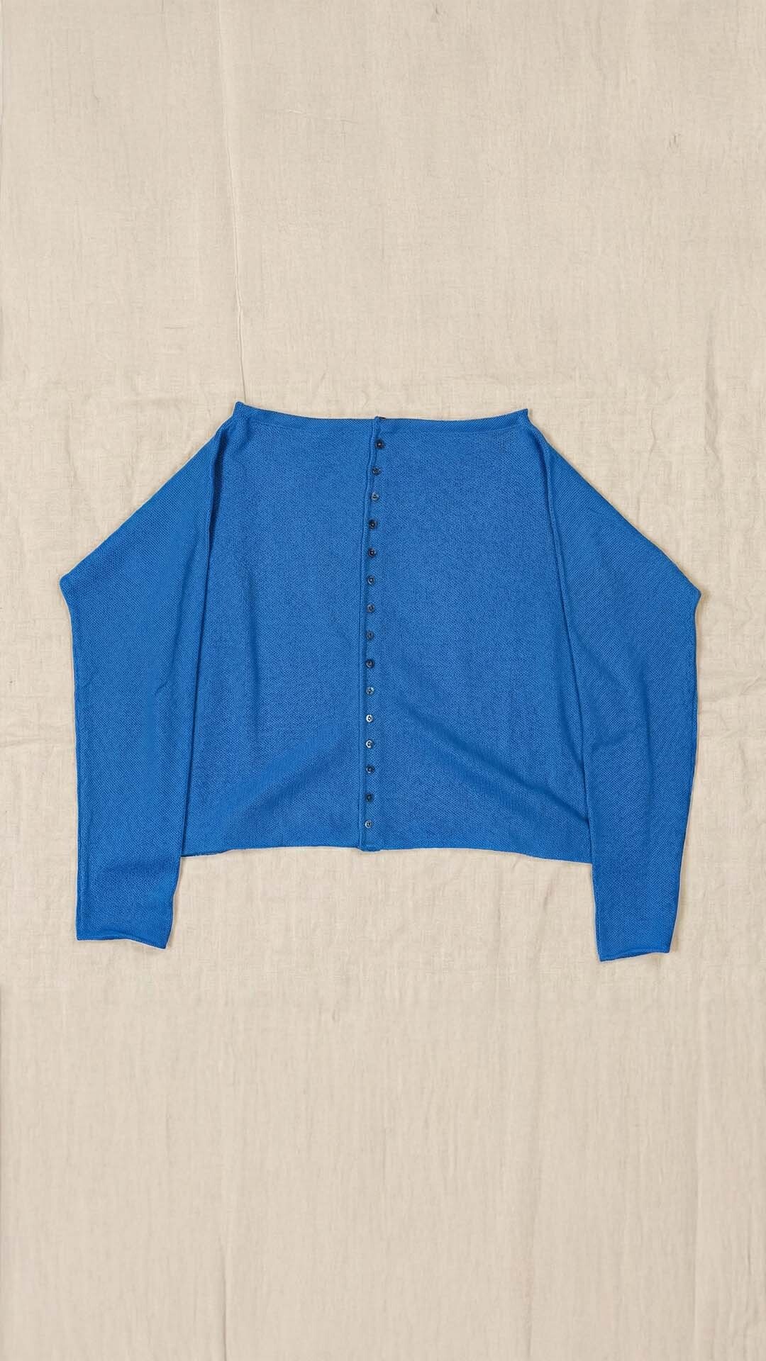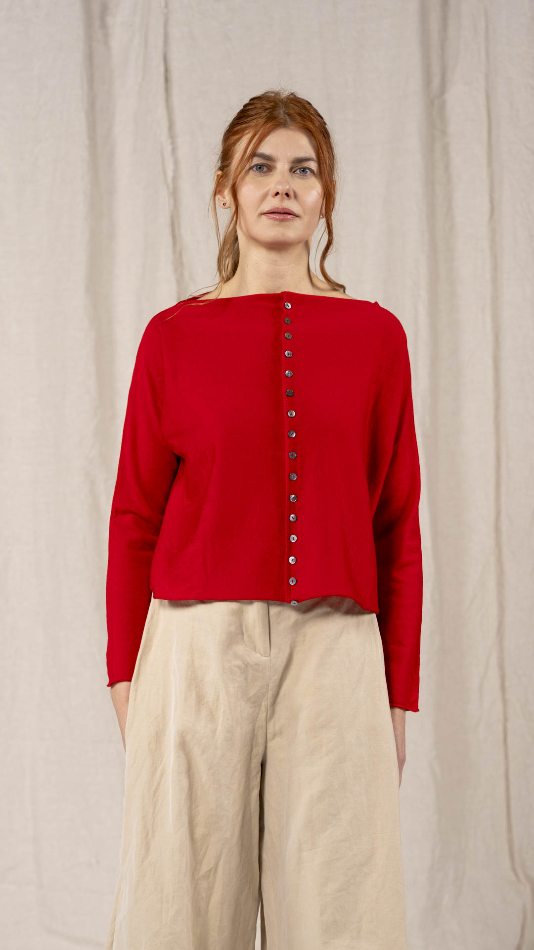 Maglia “Kimono” con scollo a barca e una fila di quindici bottoncini in madreperla. Il capo, lavorato a partire dalla manica, è reversibile e può essere indossato con l’abbottonatura sul davanti o sul retro. Un modello iconico della collezione Officinae.
