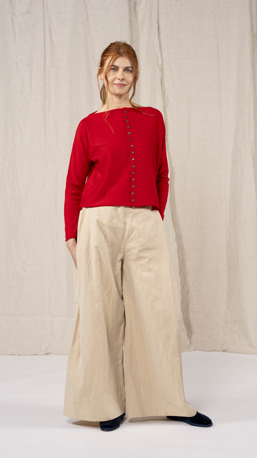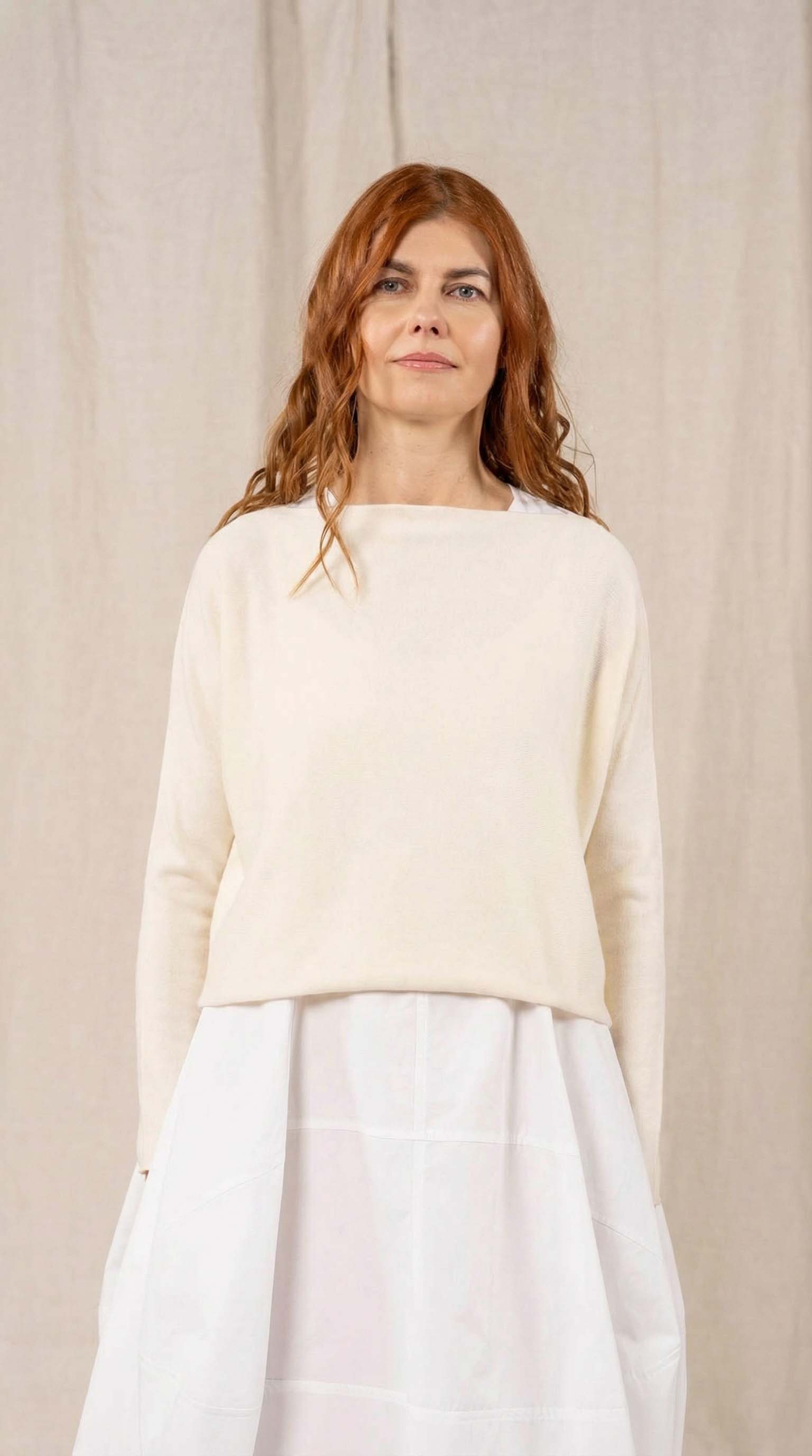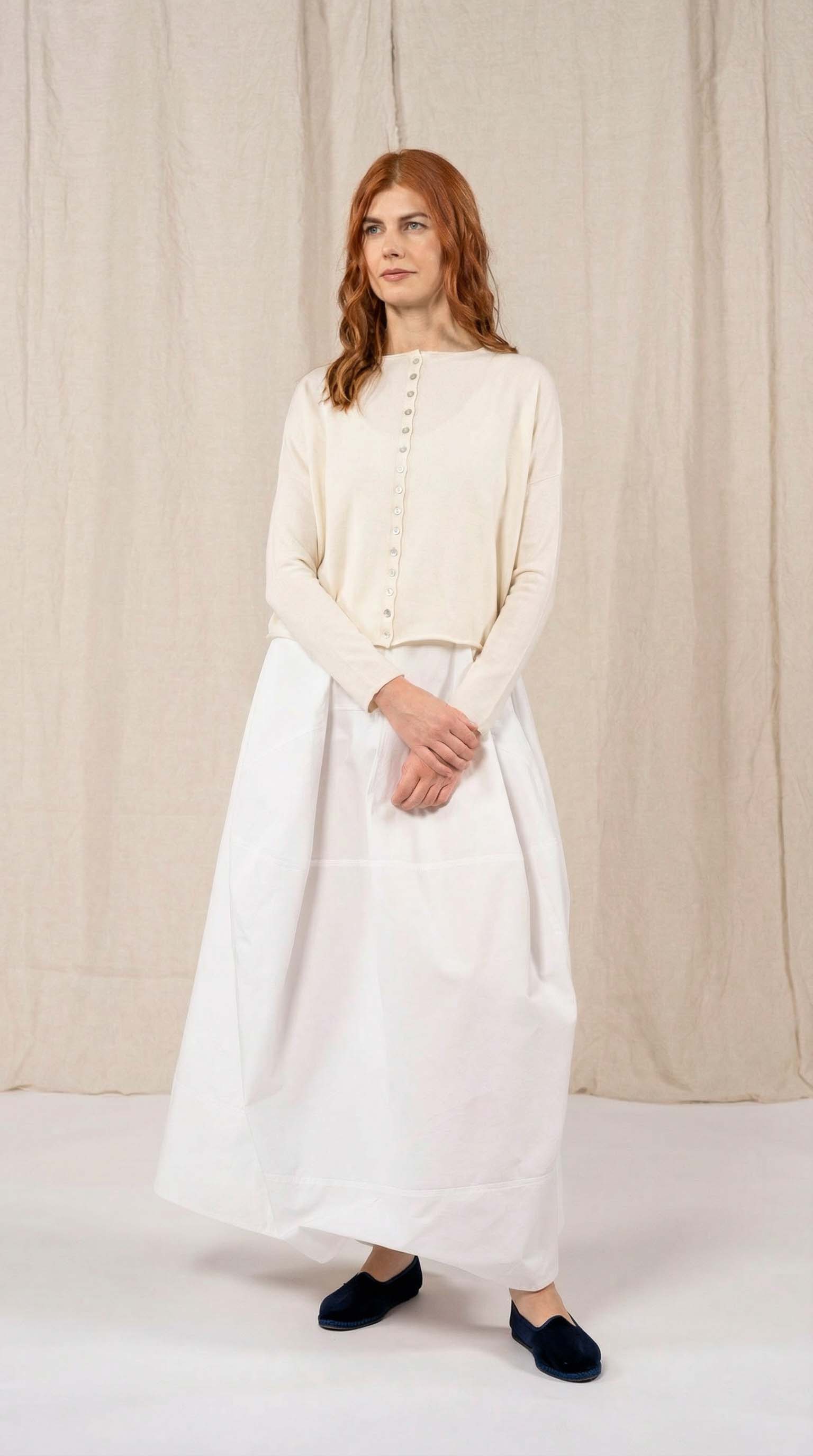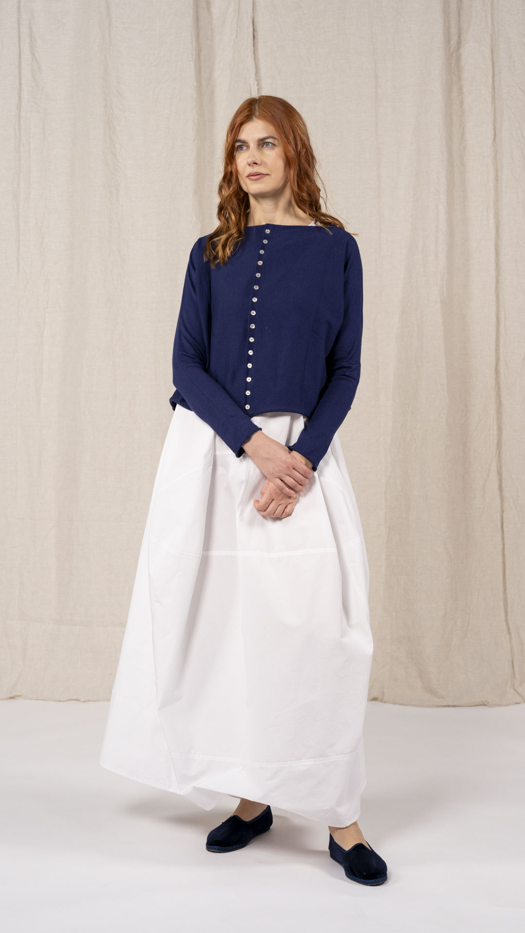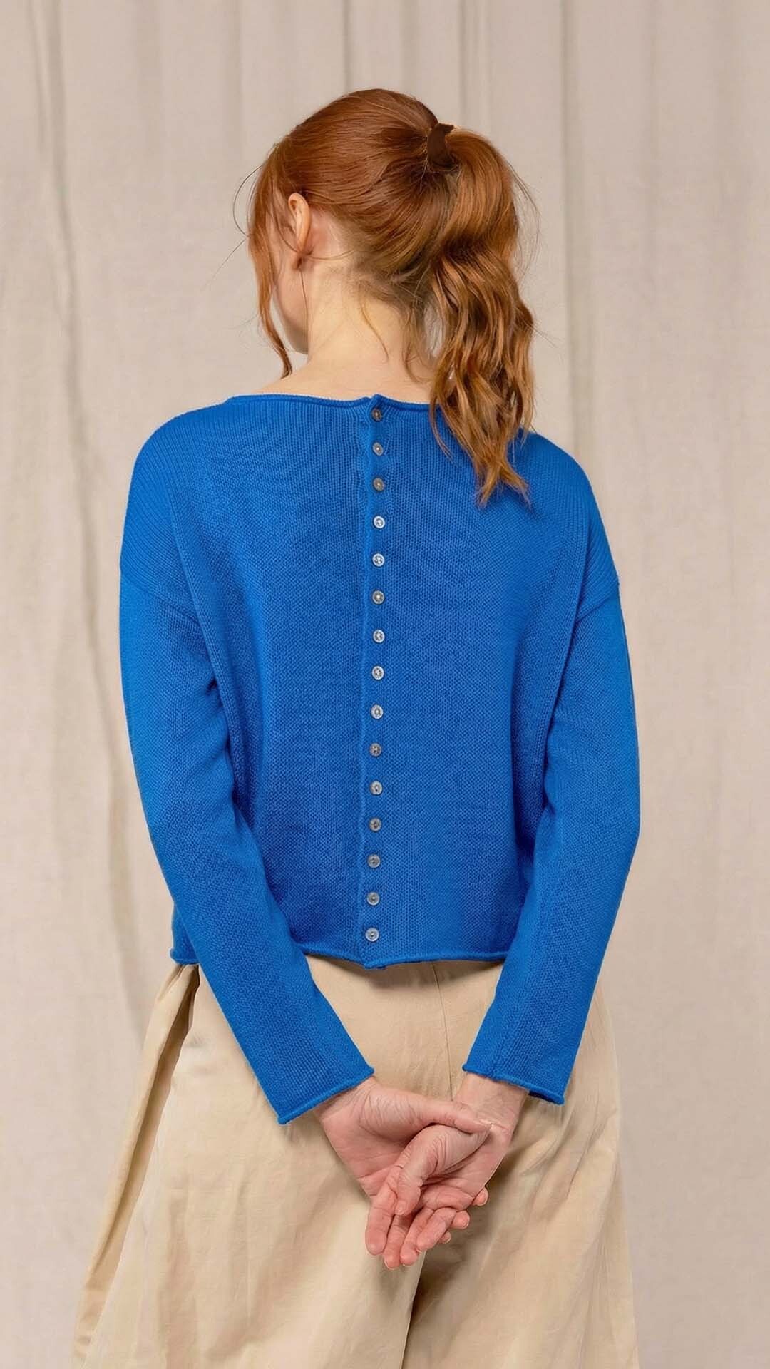 Maglia “Kimono” con scollo a barca e una fila di quindici bottoncini in madreperla. Il capo, lavorato a partire dalla manica, è reversibile e può essere indossato con l’abbottonatura sul davanti o sul retro. Un modello iconico della collezione Officinae.
