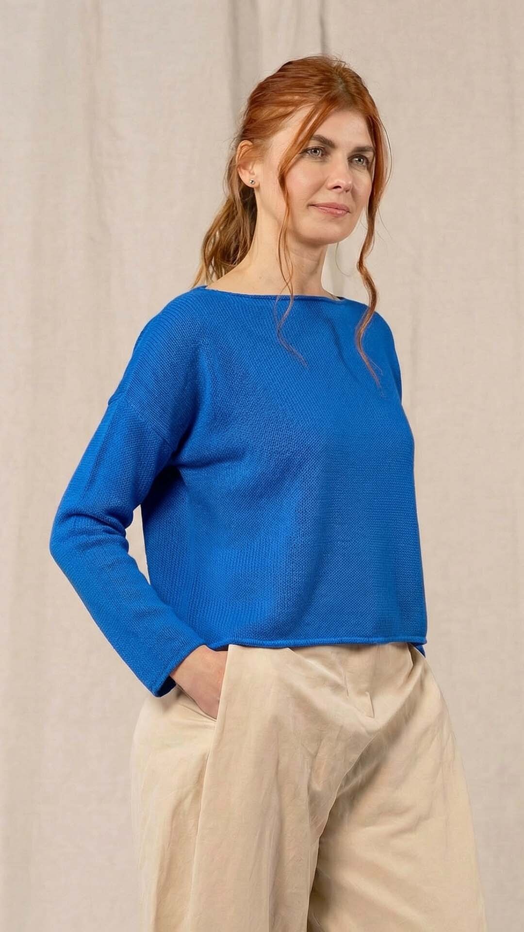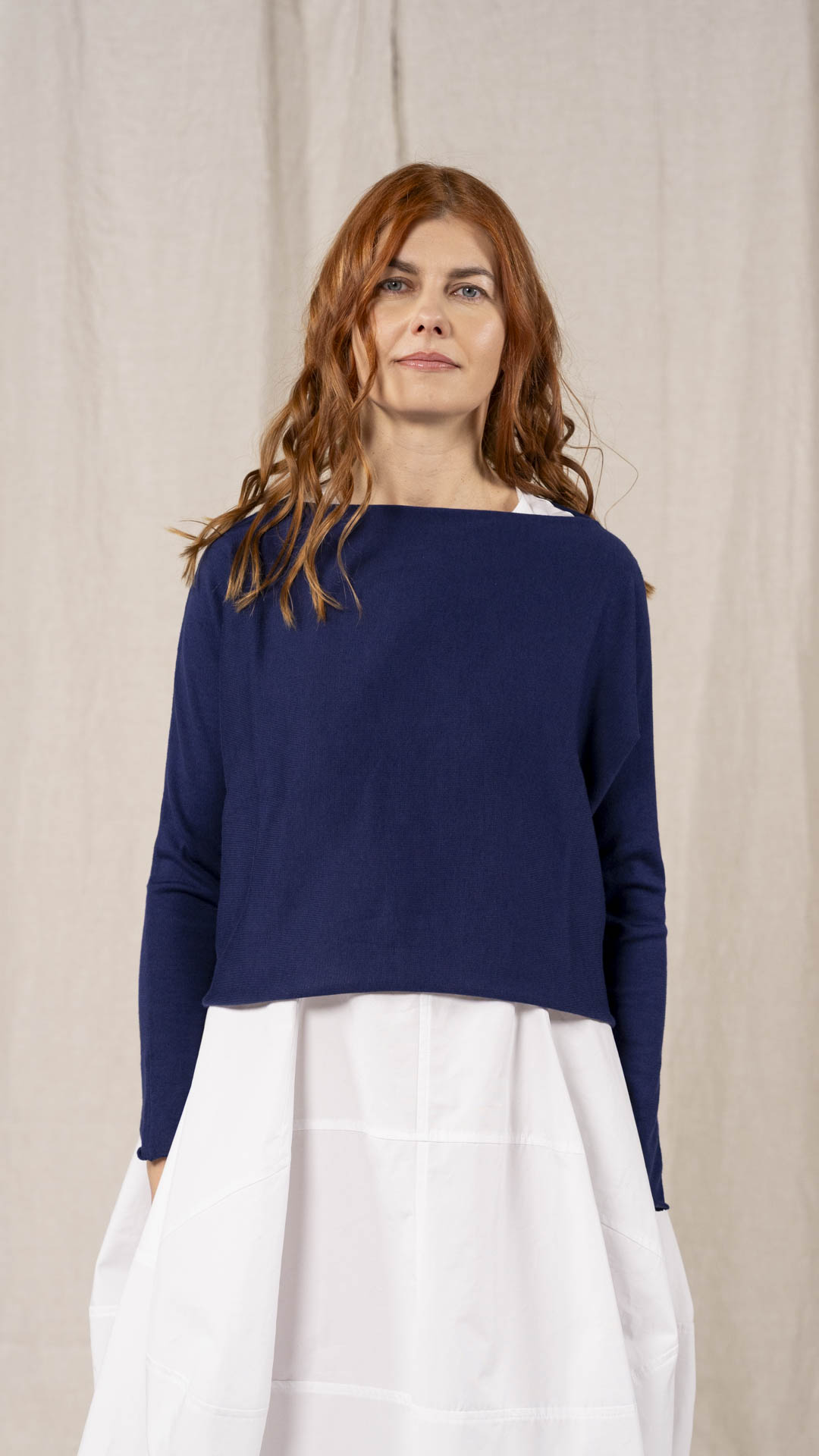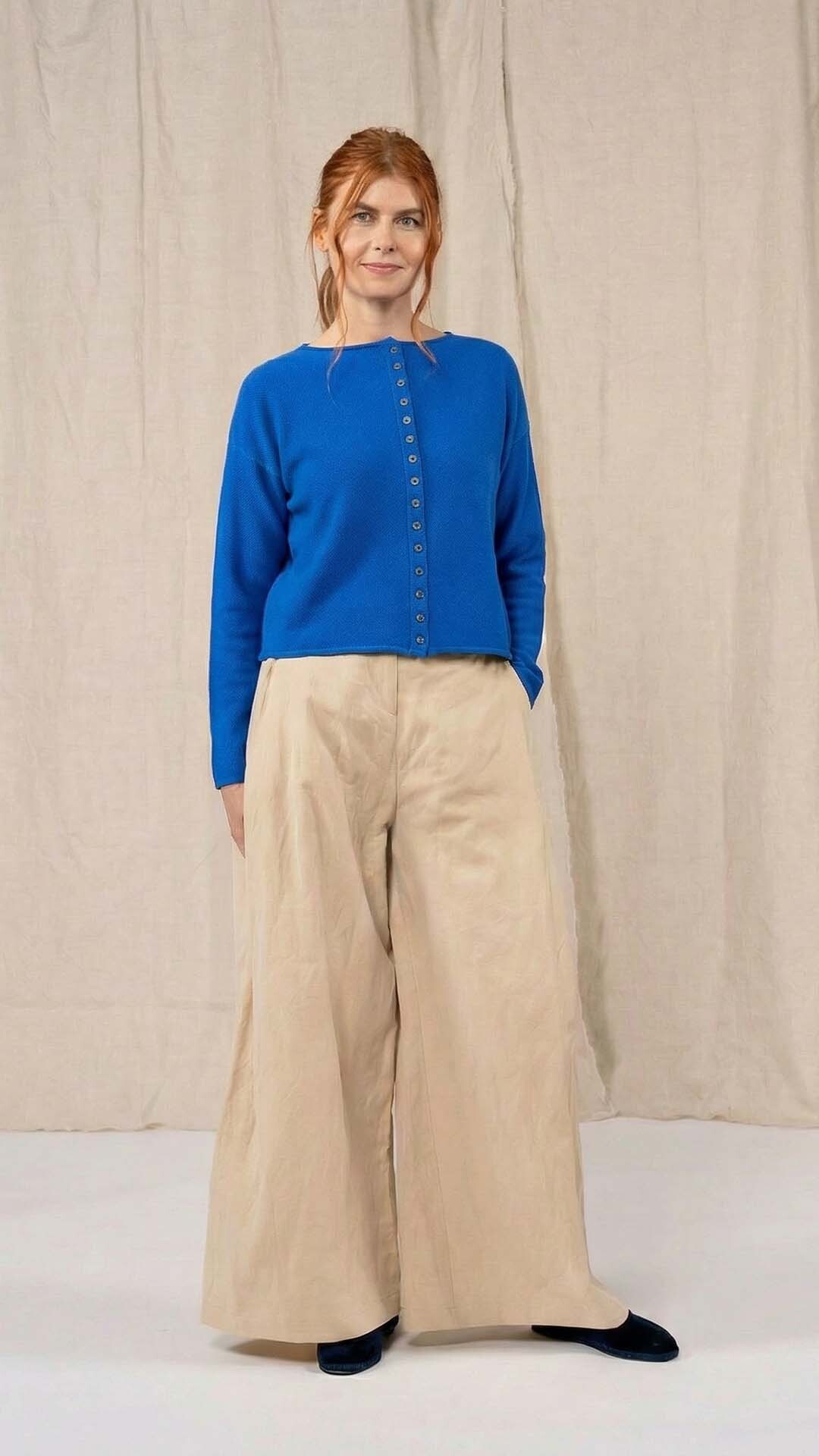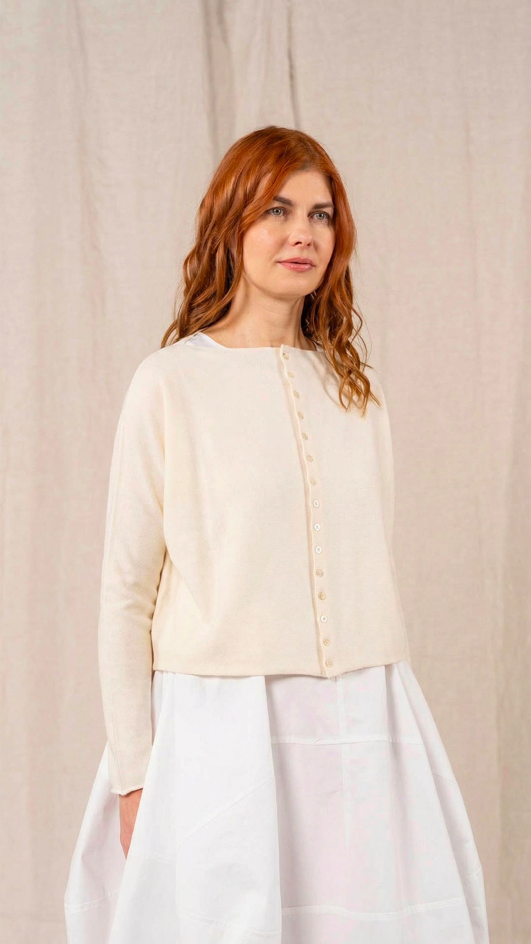 Maglia “Kimono” con scollo a barca e una fila di quindici bottoncini in madreperla. Il capo, lavorato a partire dalla manica, è reversibile e può essere indossato con l’abbottonatura sul davanti o sul retro. Un modello iconico della collezione Officinae.