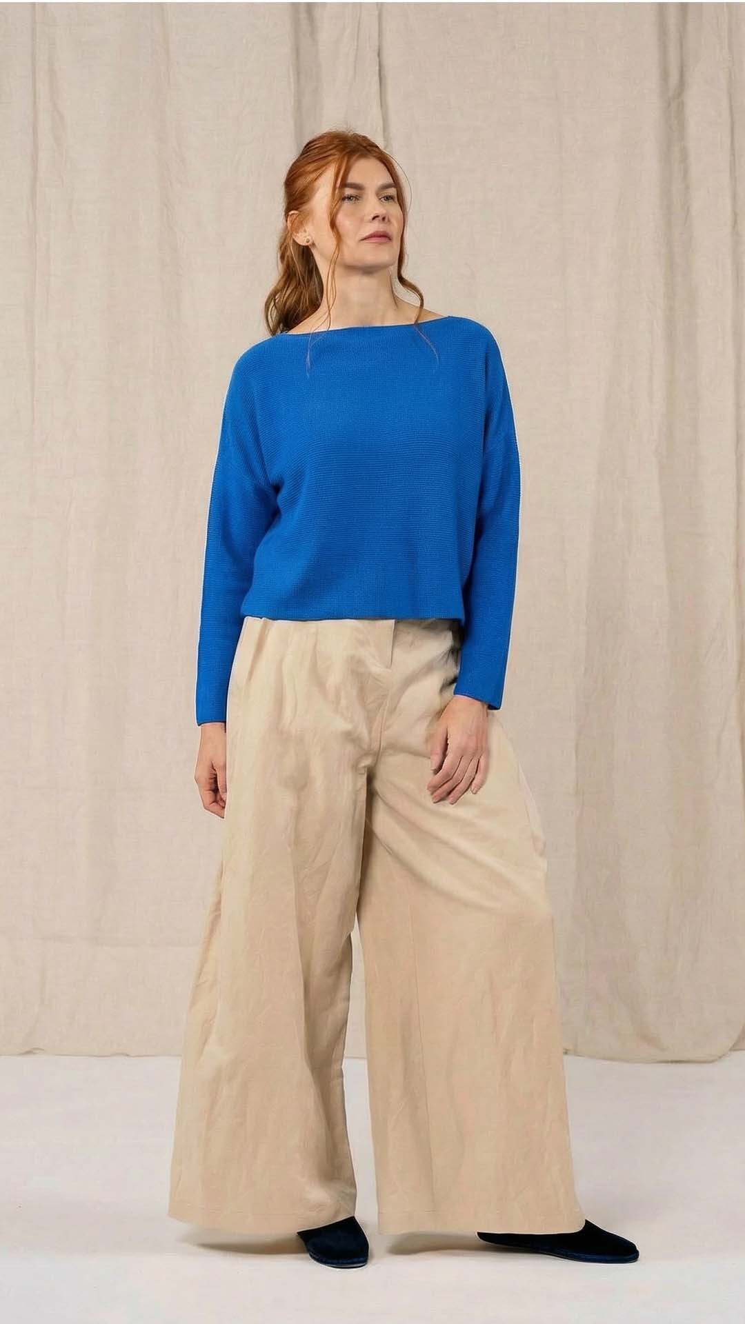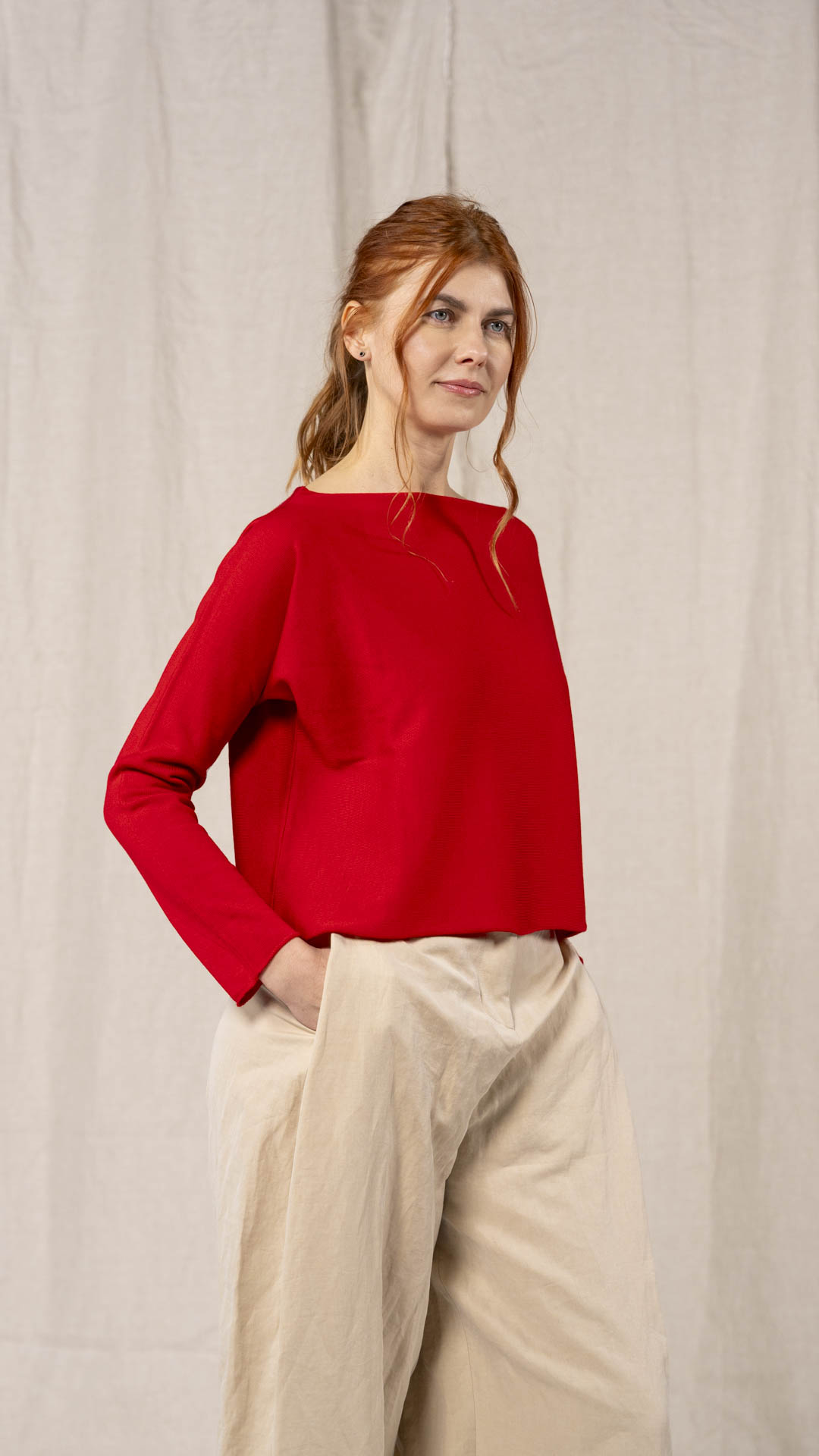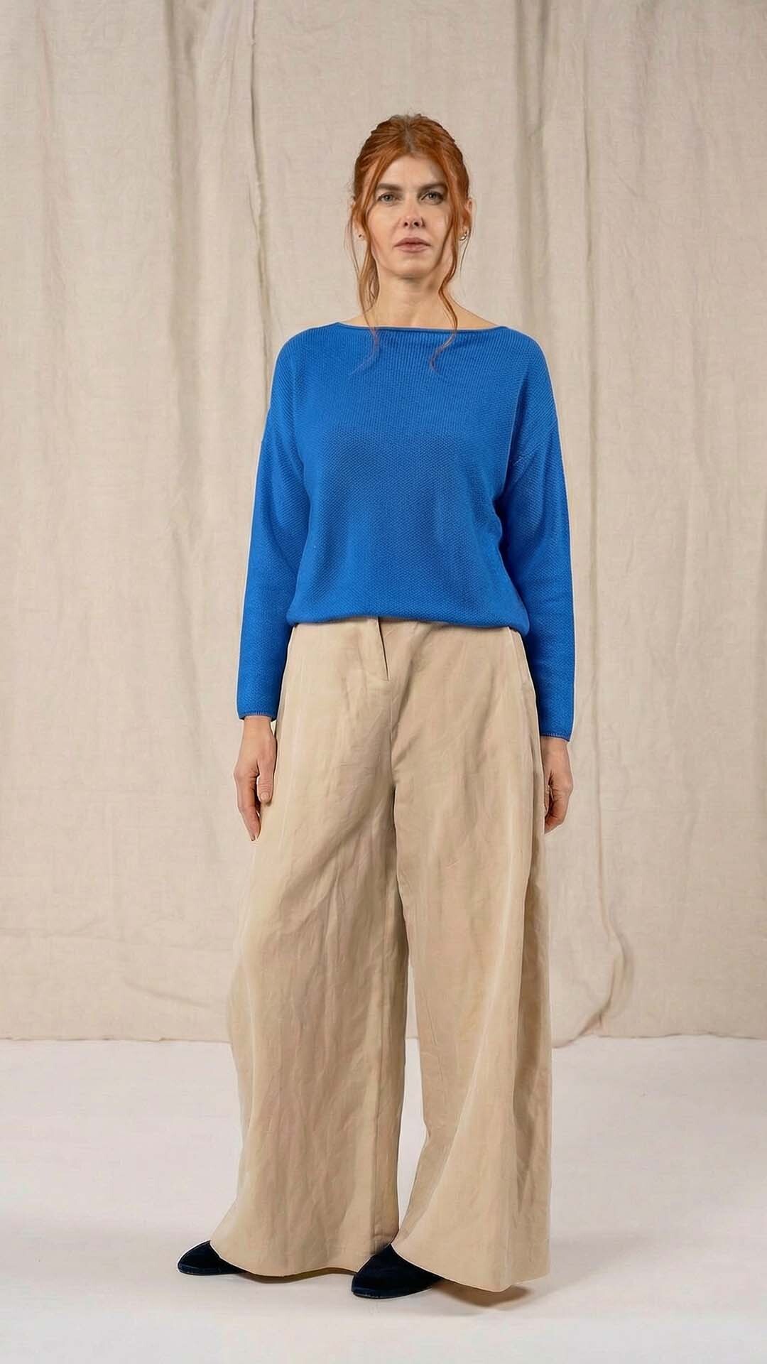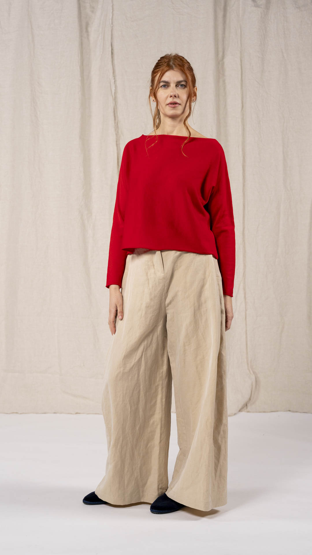 Maglia “Kimono” con scollo a barca e una fila di quindici bottoncini in madreperla. Il capo, lavorato a partire dalla manica, è reversibile e può essere indossato con l’abbottonatura sul davanti o sul retro. Un modello iconico della collezione Officinae.