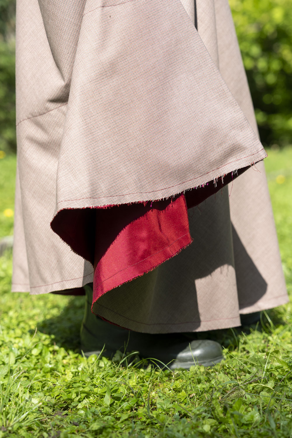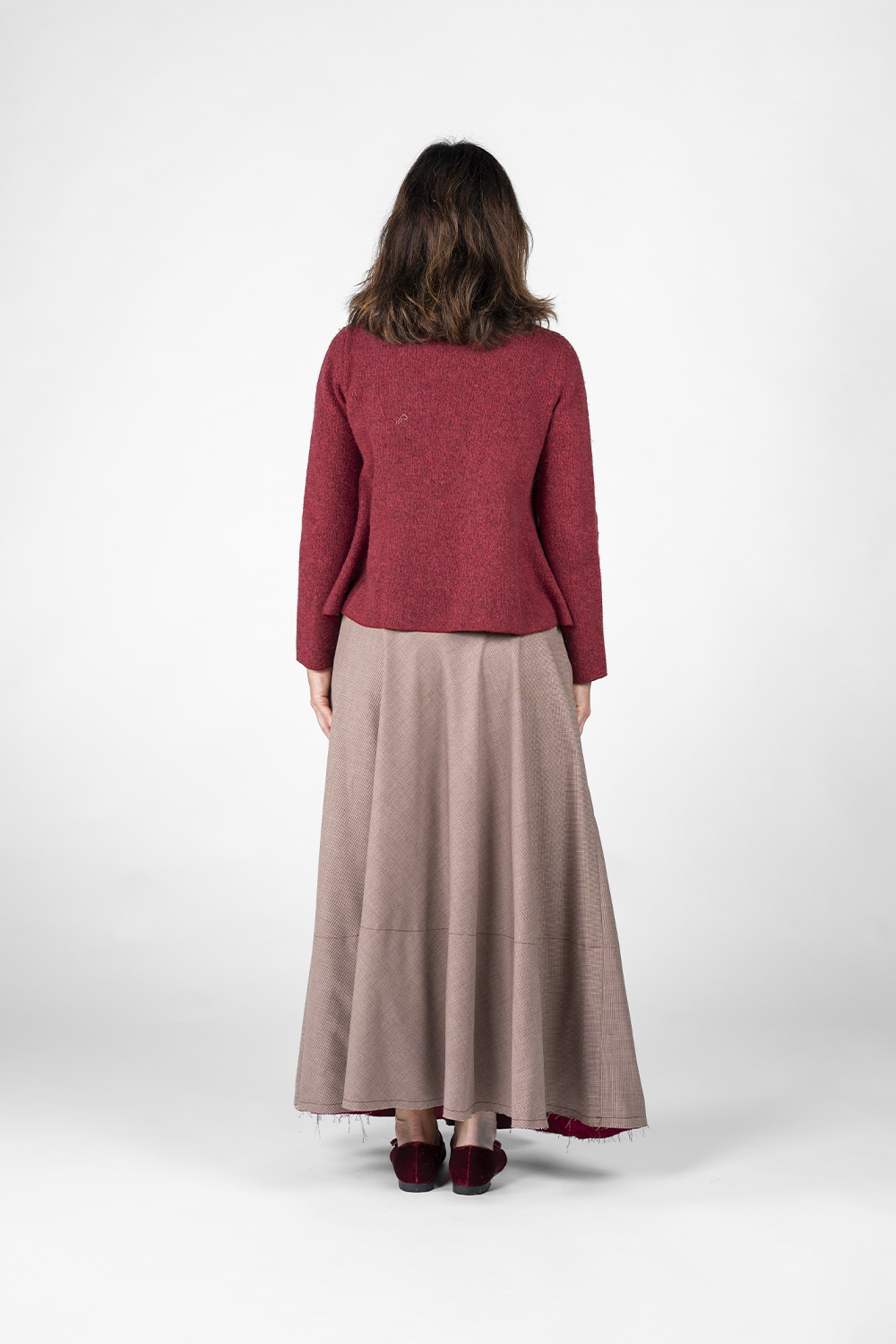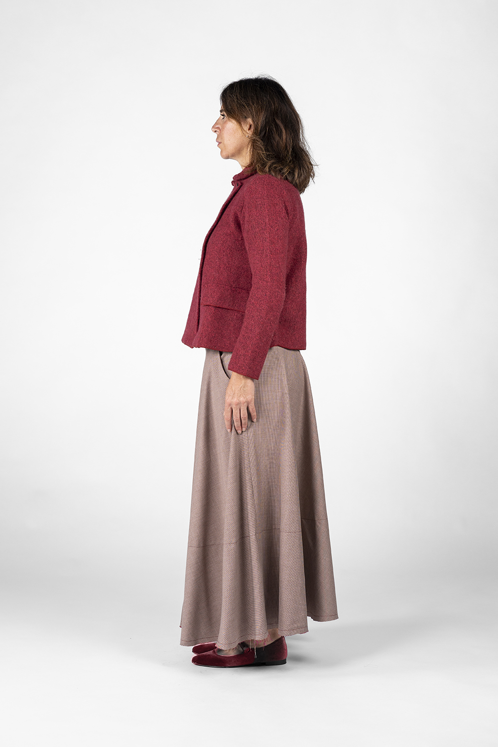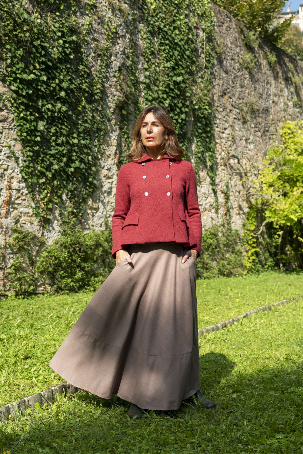 Gonna a mezza ruota longuette, leggermente svasata, con tasche, realizzata in morbida lana scozzese. La chiusura, con bottone in madreperla e zip invisibile, si trova all’altezza del cinturino, sul lato sinistro, e assicura una perfetta vestibilità. L’ampiezza è esaltata dalla doppiatura interna del tessuto, realizzata in taffetà, sul fondo del capo a partire dalla cucitura orizzontale.
